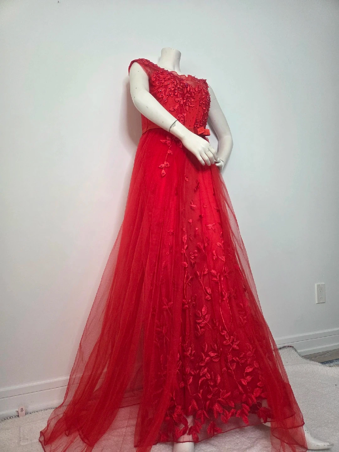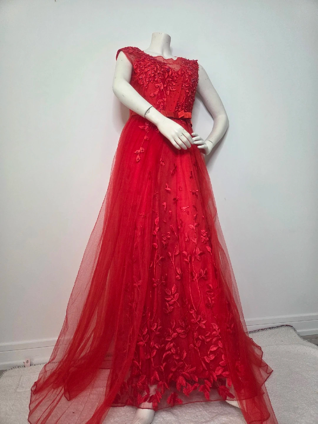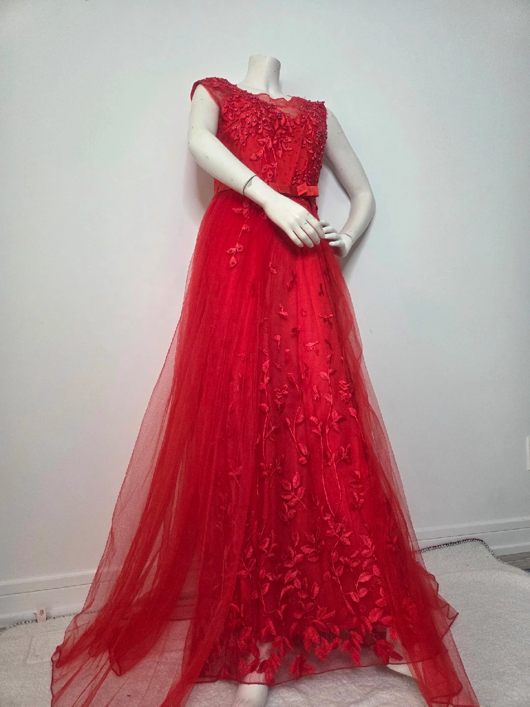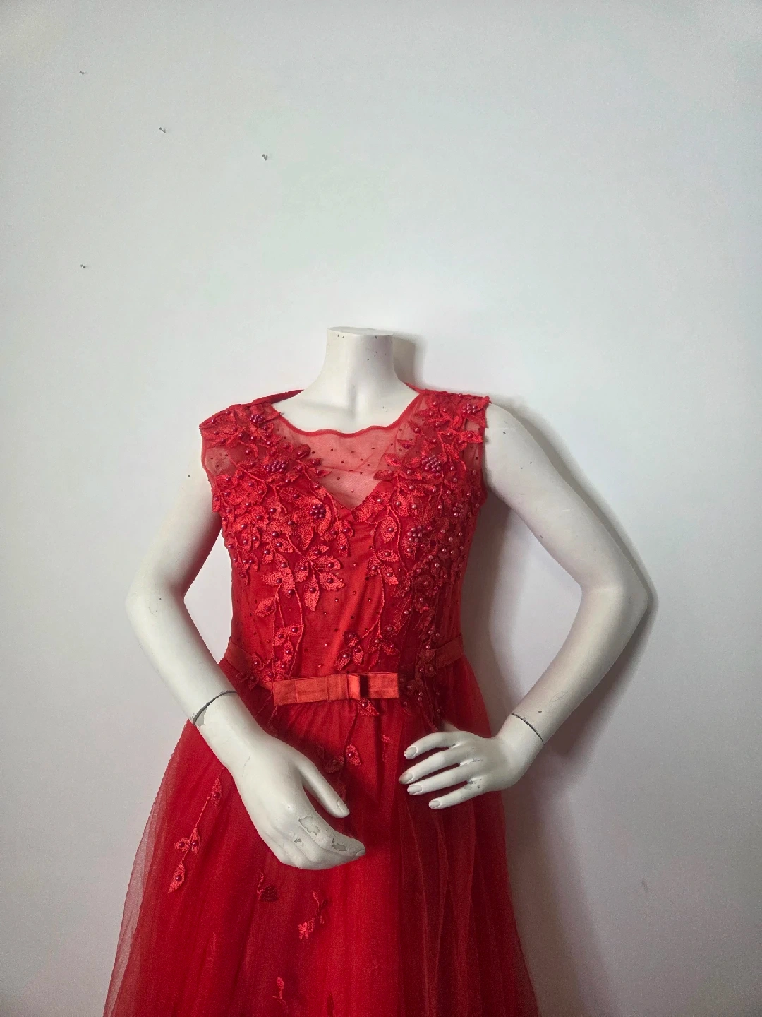 70Beautiful red dress with intricate floral detailing. Perfect for a special occasion!