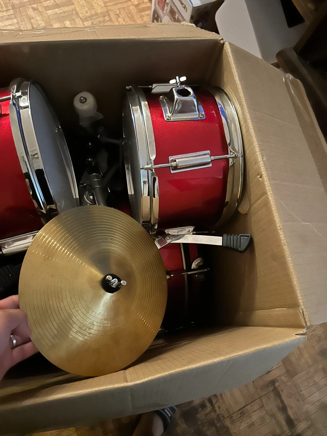 Selling a red drum set. It's in good condition and ready for a new home! Comes in a box with the components as pictured. Perfect for someone looking to start playing the drums or upgrade their current set