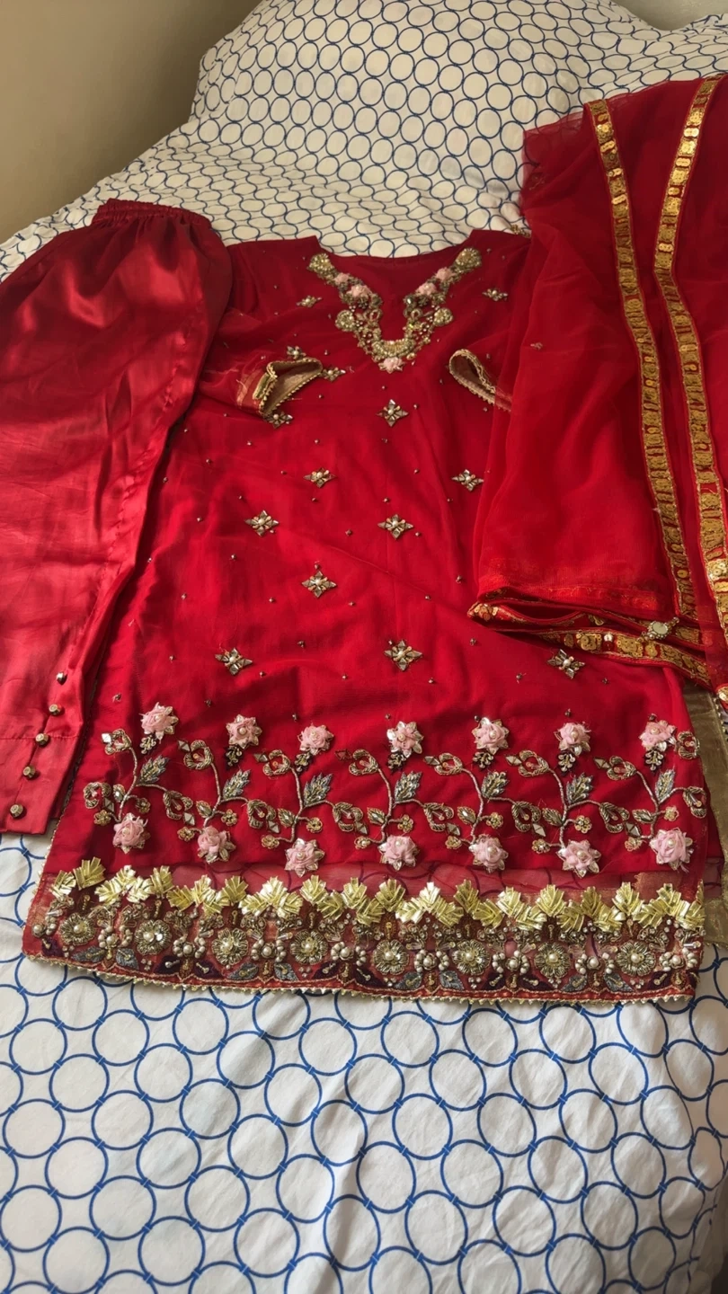 10Beautiful red salwar kameez suit with intricate embroidery! The fabric has a lovely sheen, and the detailing includes gold accents and delicate floral designs. Perfect for a special occasion or celebration