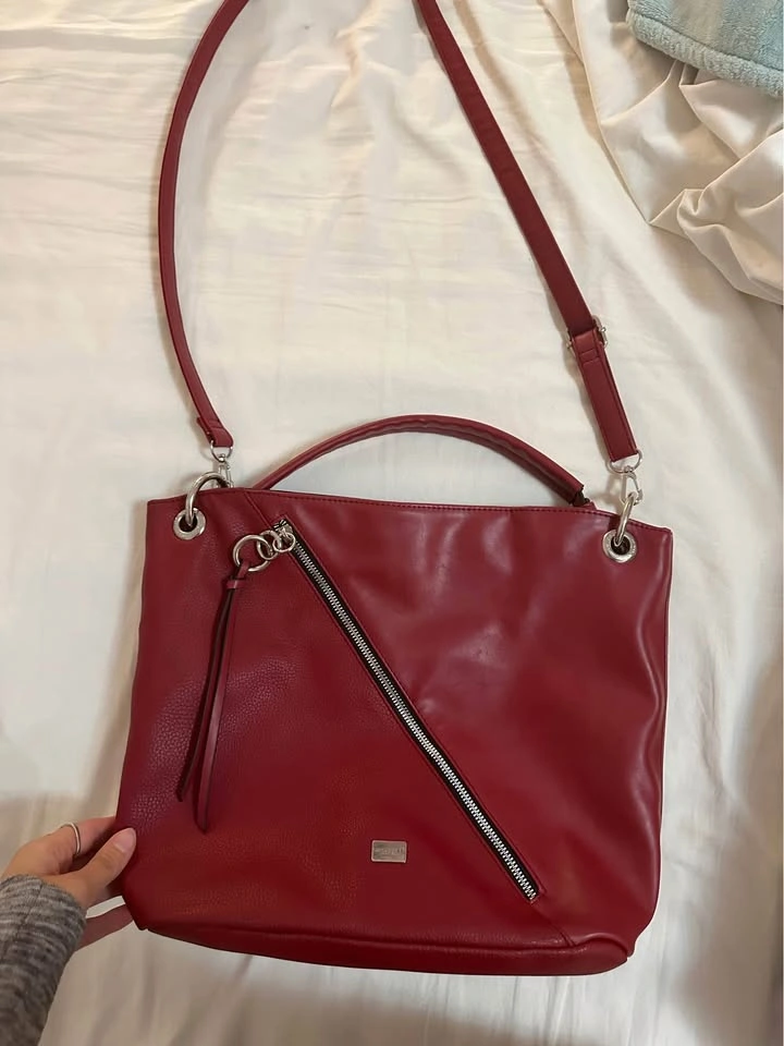 19Like new! Has a hand handle and a shoulder strap (adjustable). Can also be removed. Compartments: One main large one with zipper (inside there is one medium with zipper & two small without), one medium on the back exterior with zipper. The one on the front is just for decoration. LENGTH: 15” WIDTH: 4.5” HEIGHT TO ZIPPER: 11”