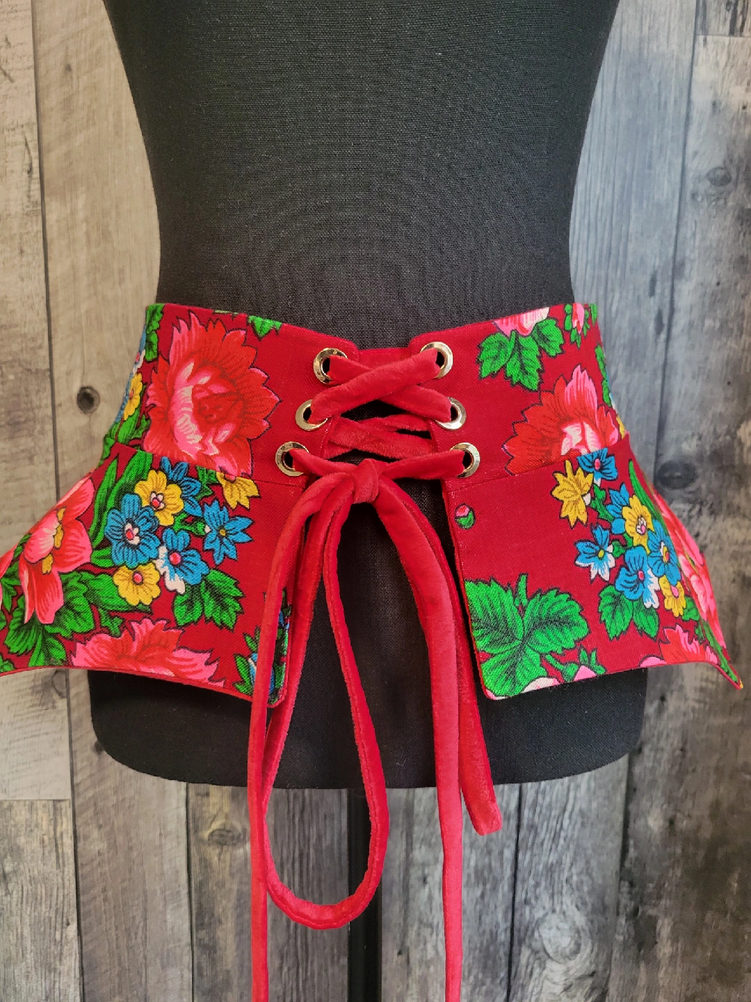 10This red floral corset belt is a unique and eye-catching accessory! It features a vibrant floral pattern with red velvet ties for a secure and stylish fit. Perfect for adding a pop of colour and a touch of vintage charm to any outfit