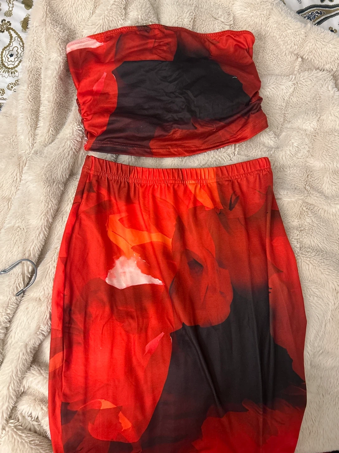 65Selling a cute red floral two-piece set. The set includes a tube top and a matching skirt. It's in great condition and perfect for a fun day out!