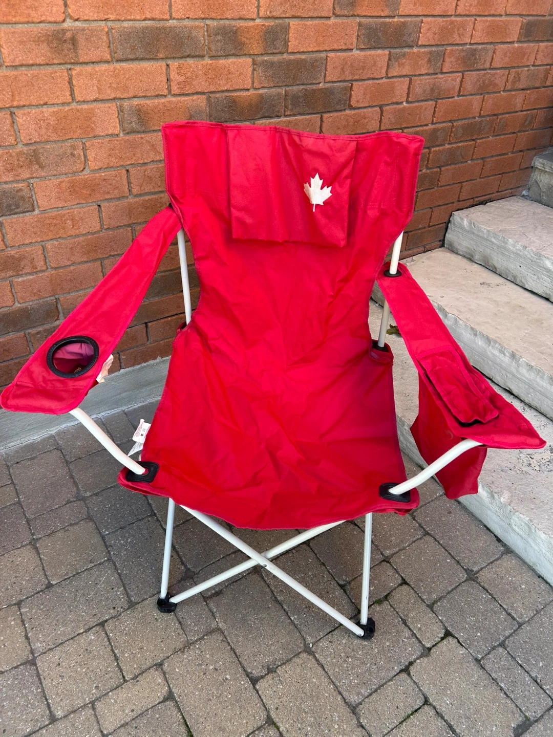 149Relax in this folding chair, perfect for camping, picnics, or backyard lounging. This used red chair features a convenient cup holder and a maple leaf design. The chair is in good condition and ready for your next outdoor adventure. * Sturdy steel frame * Built-in cup holder * Folds for easy storage * Lightweight and portable Looking to add a touch of Canadian flair to your outdoor seating? This chair is just the ticket! And yes, if you're seeing this ad, the chair is still available; I'll remove the ad once it's sold. Based on similar Kijiji listings, I've priced this chair at $5 a great deal for a chair that's ready for summer fun.