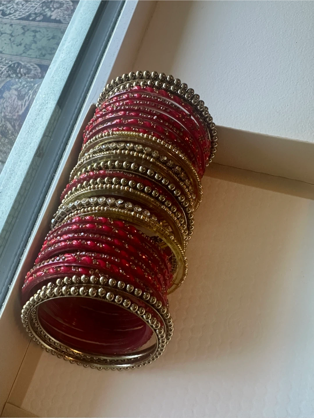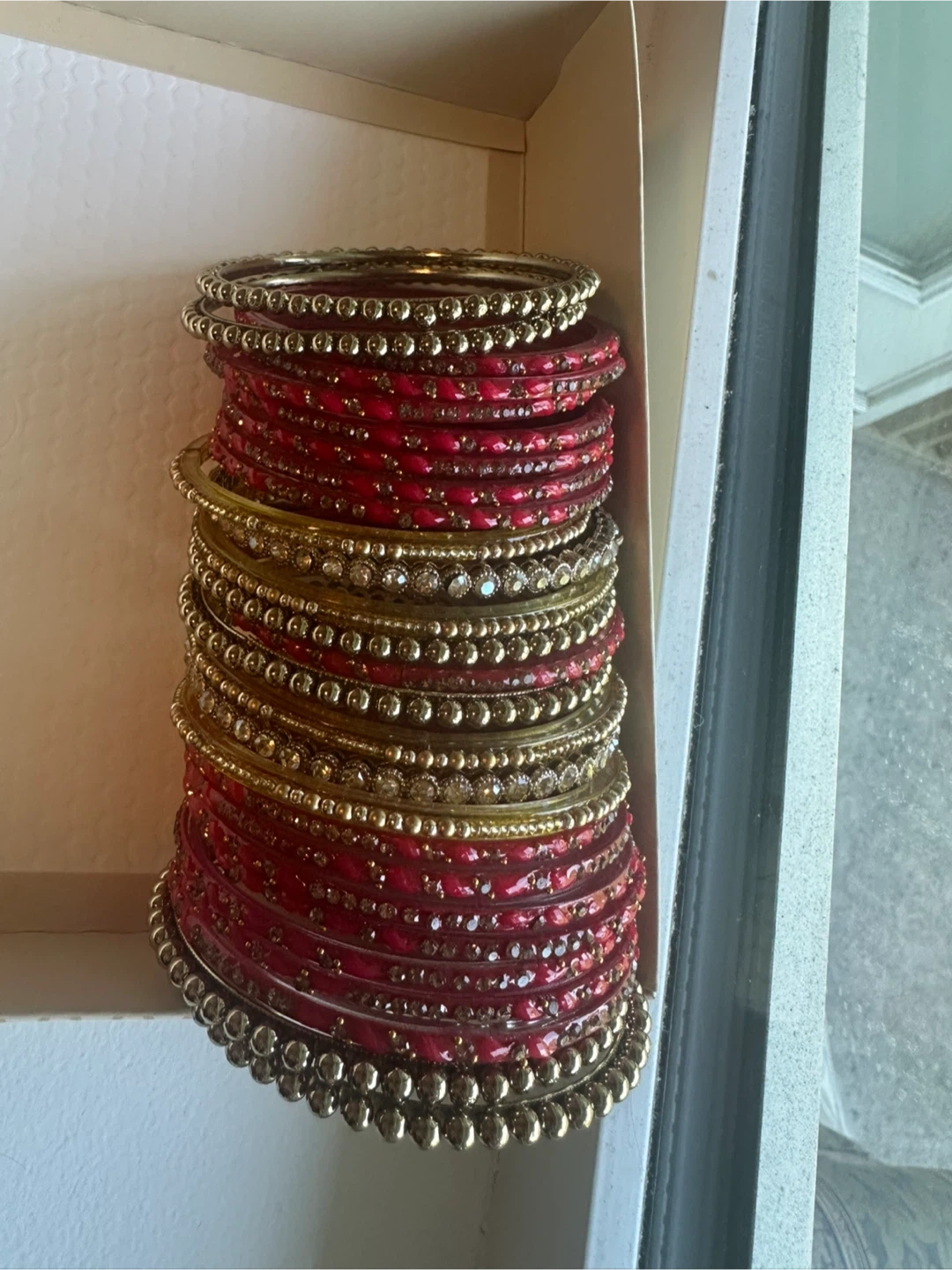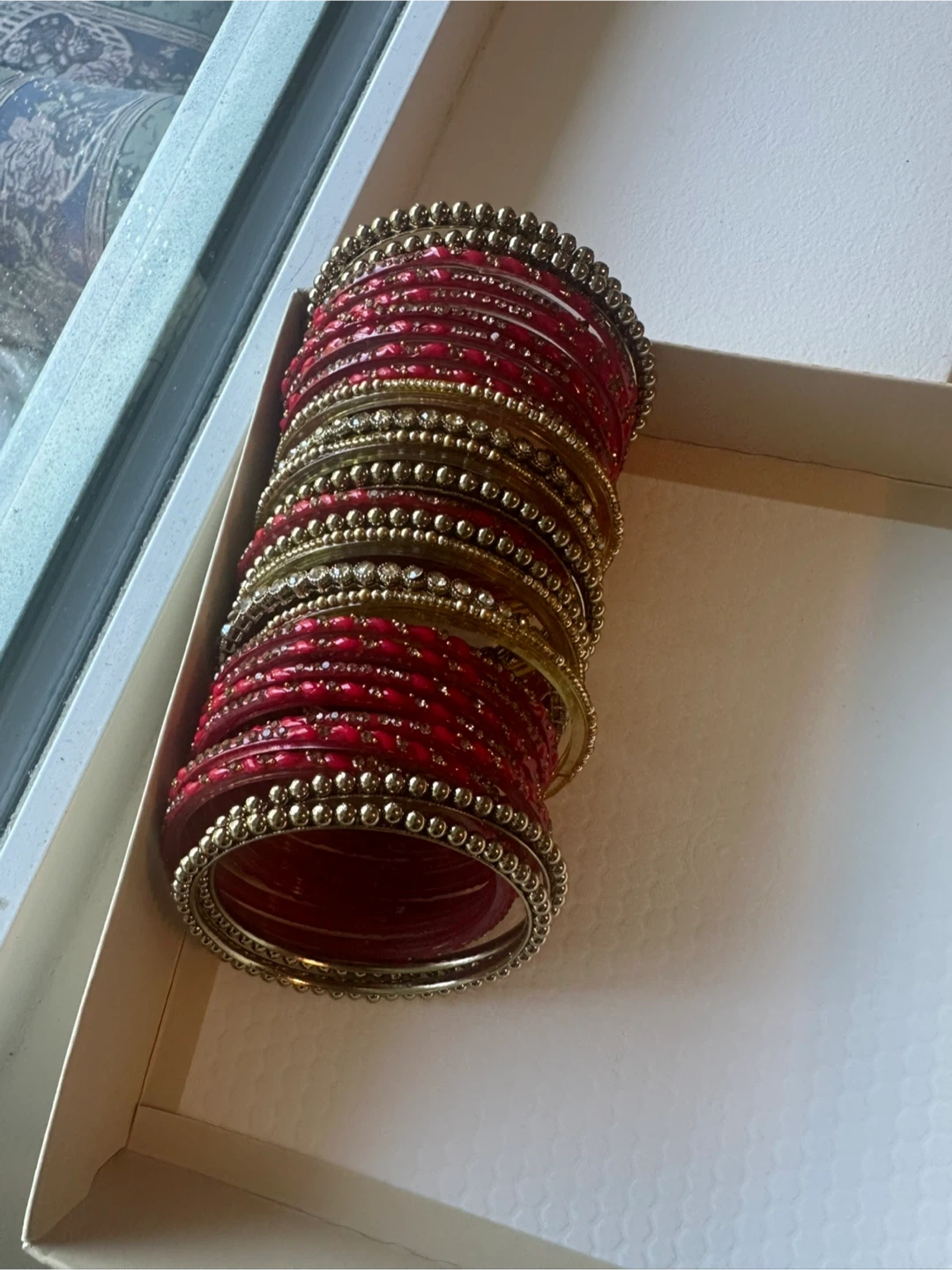 Selling a set of red and gold bangles. They have a beaded design and some have rhinestones. Comes in a box.