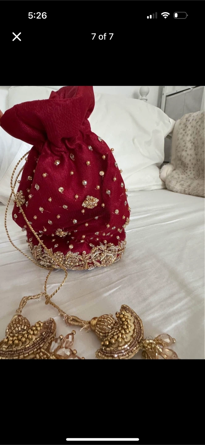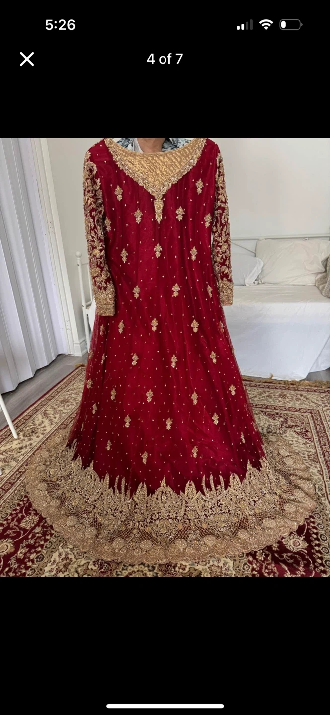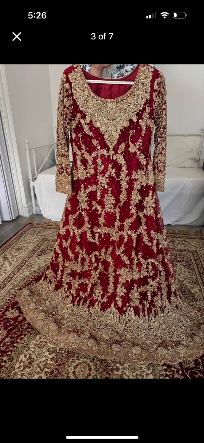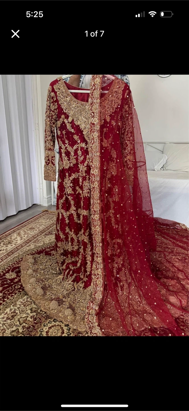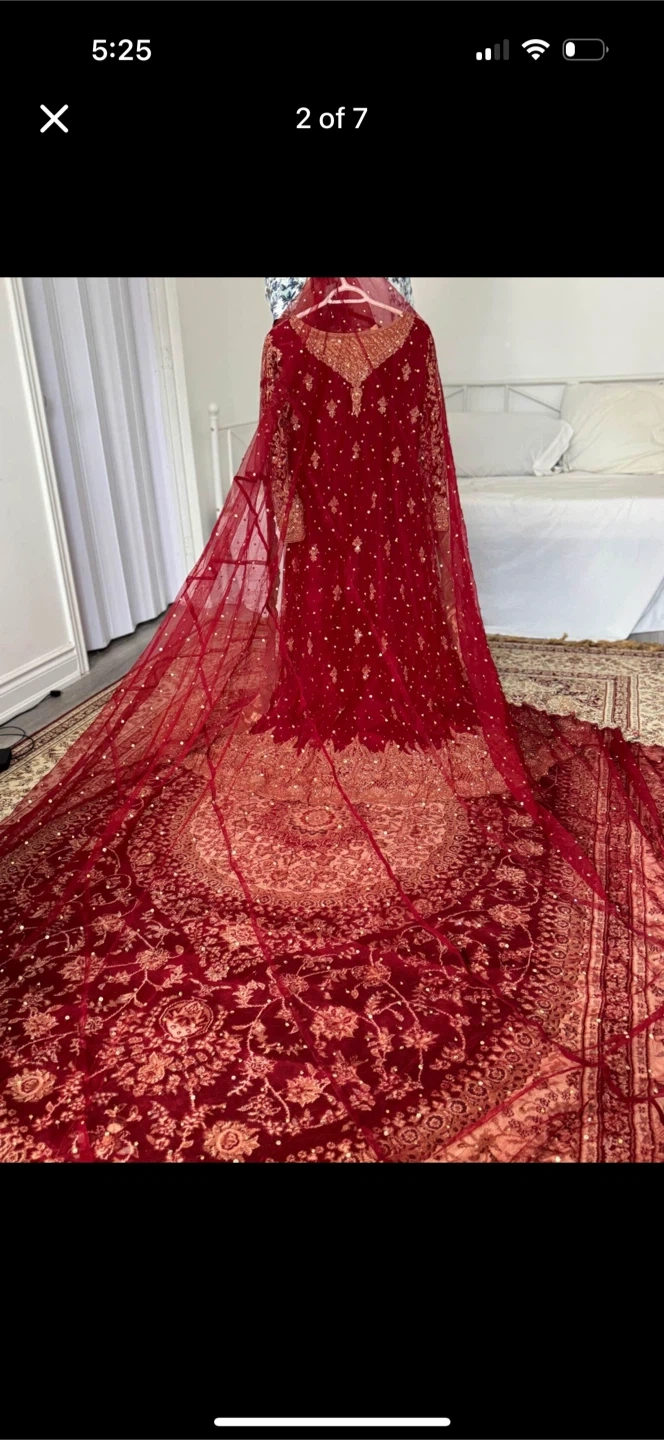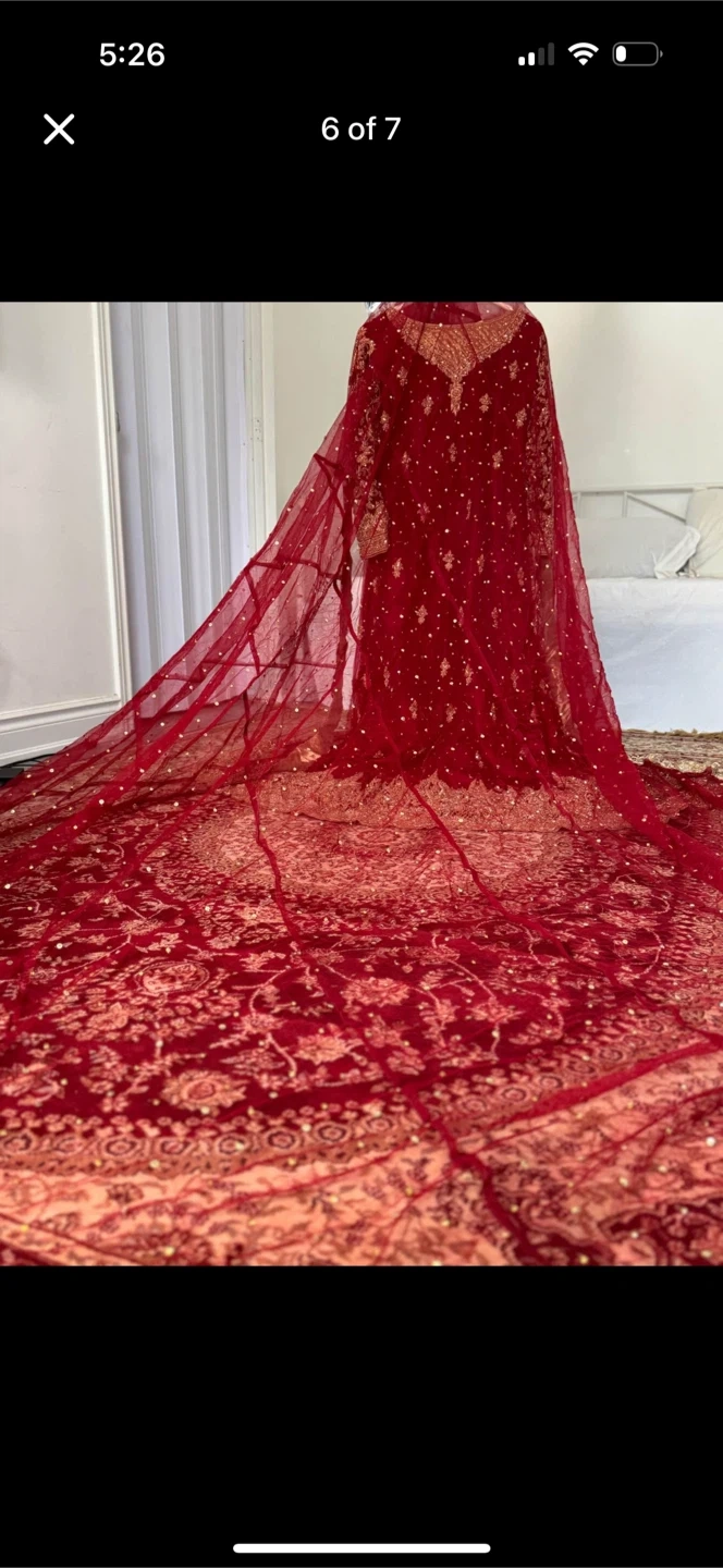 10Elegant Red Bridal Gown covered with intricate detailing! Perfect to make your sister/daughter/niece/to be bride shine on your wedding day. Comes with a long veil, a matching potli bag, as seen in the pic. Size: M Best offer Please PM for any inquiries.