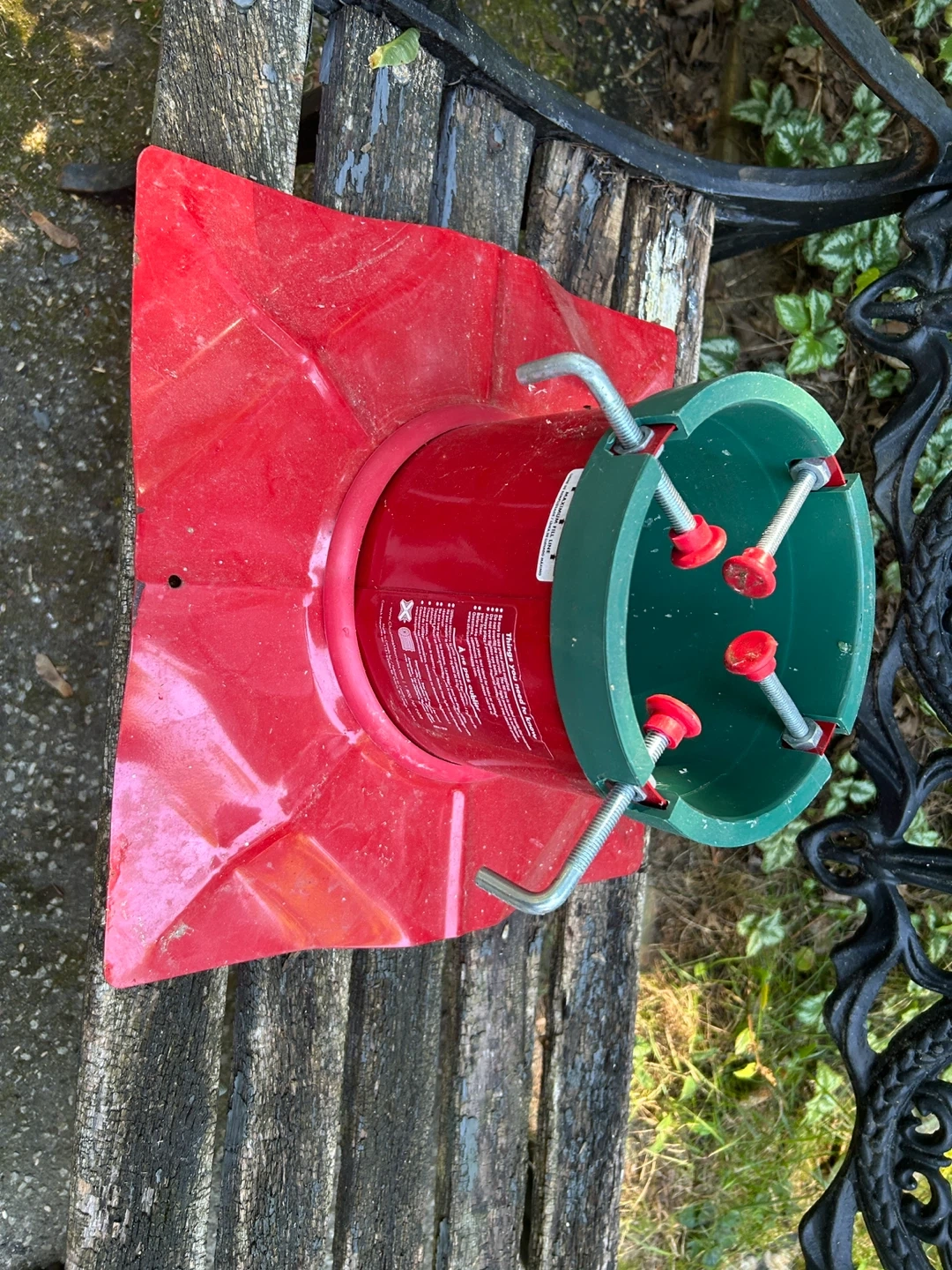 10Here's a Christmas tree stand in red and green. It looks like it's in good condition and ready to hold your tree this holiday season