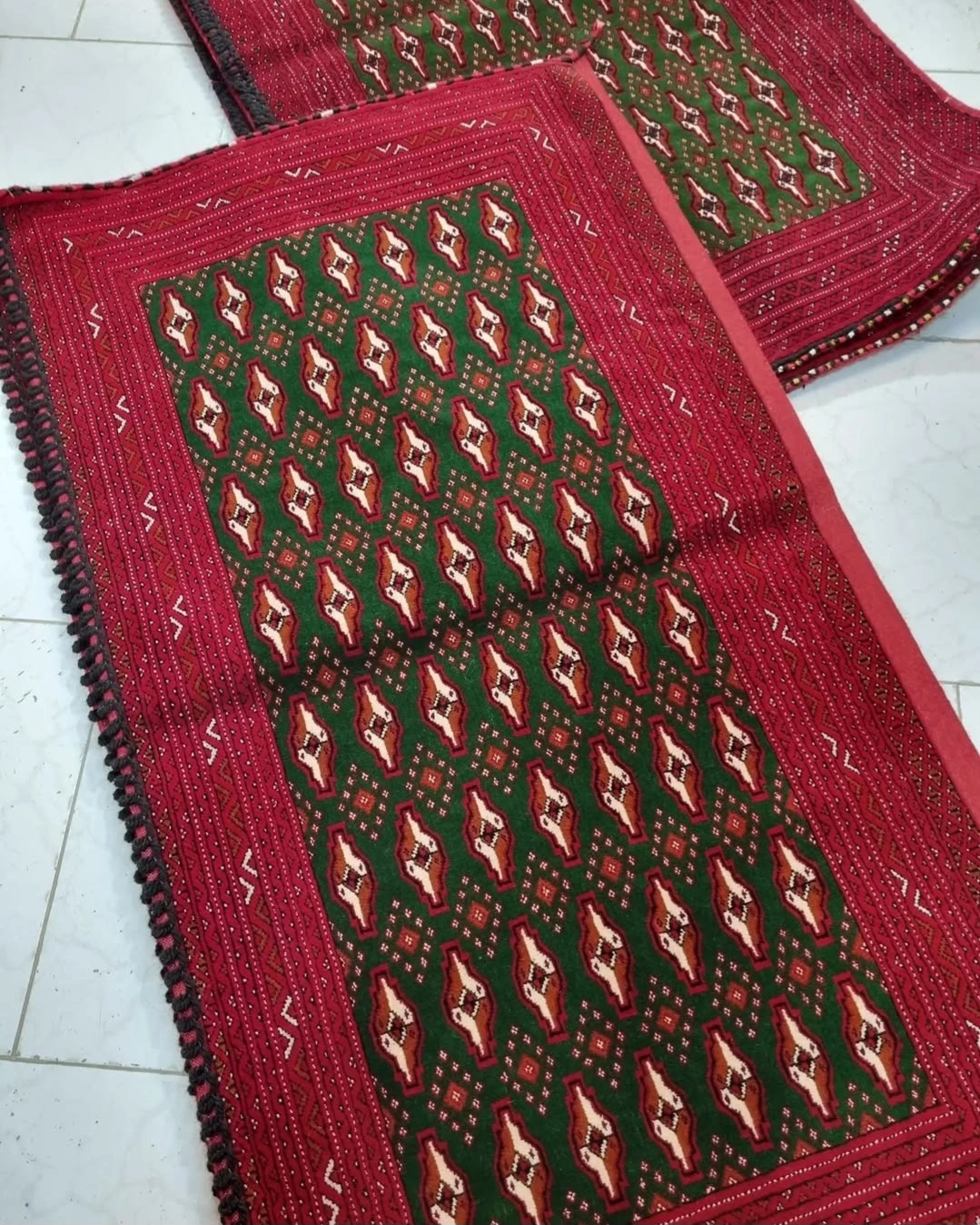 Beautiful rug with a unique red and green pattern! It would look great in any room and add a touch of warmth and style to your home