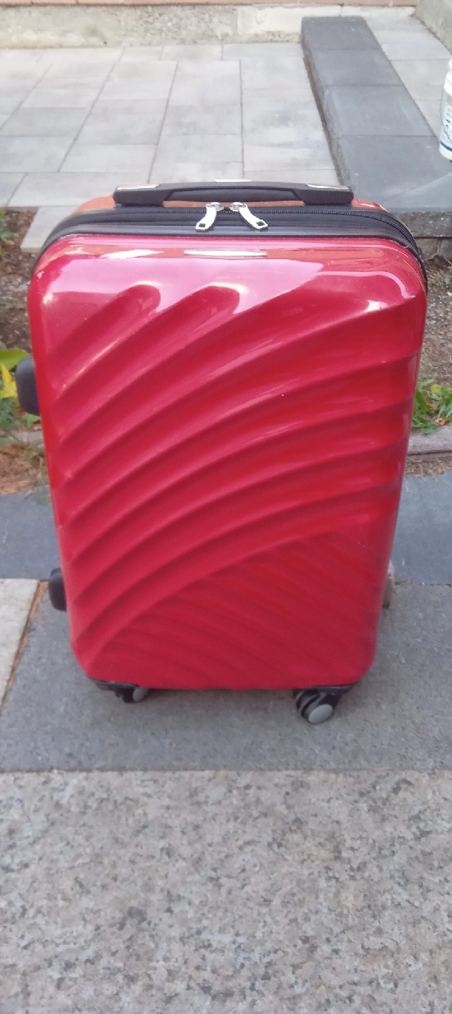 43Red hardside carry-on luggage with a unique wave pattern design! It's in great condition and ready for your next trip. Features include a retractable handle and four spinner wheels for easy maneuvering. Perfect for weekend getaways or as a cabin bag