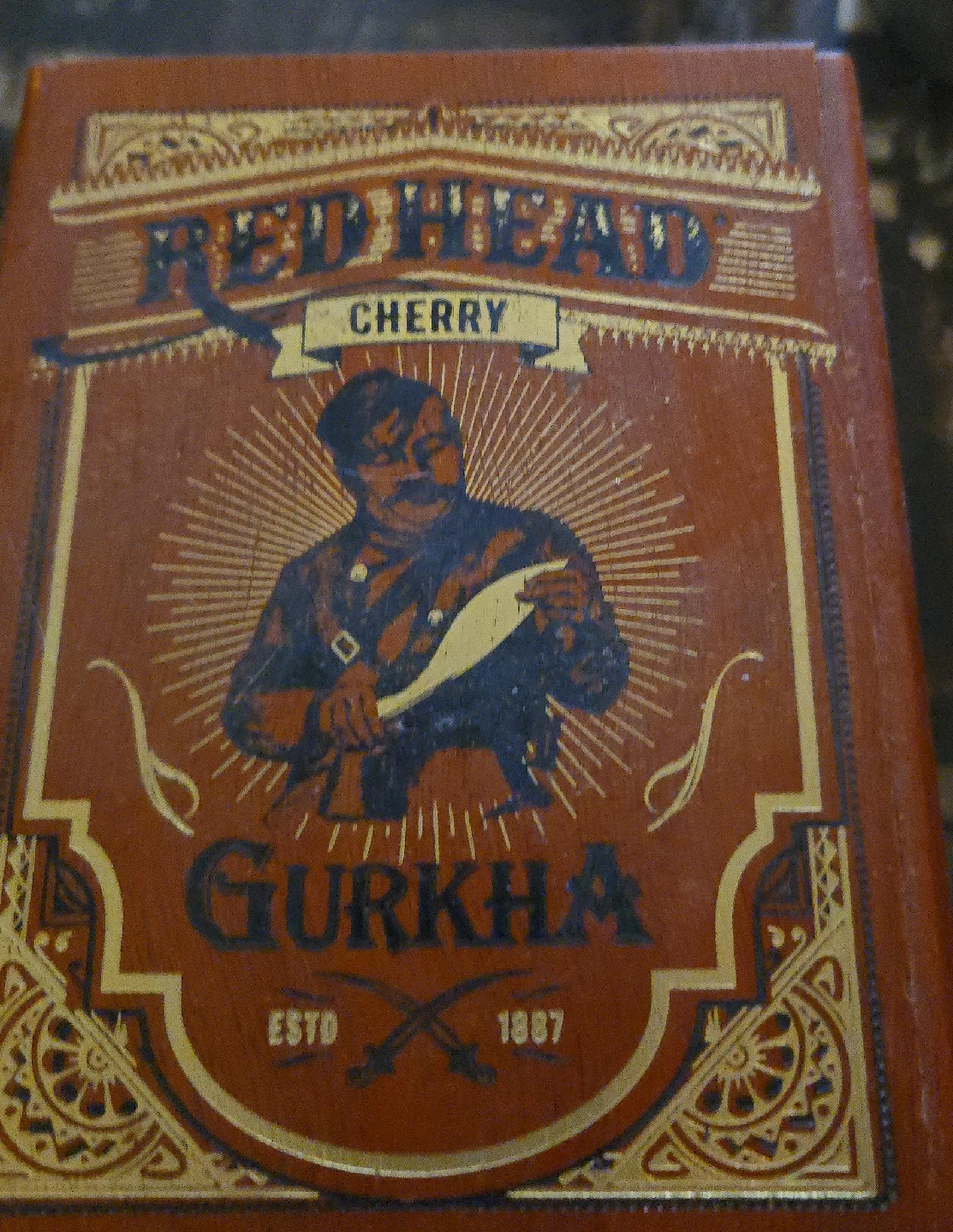 10Selling a Red Head Cherry Gurkha cigar box. It's in good condition and features a unique design with the Gurkha logo and 'ESTD 1887'. Perfect for collectors or for storing small items