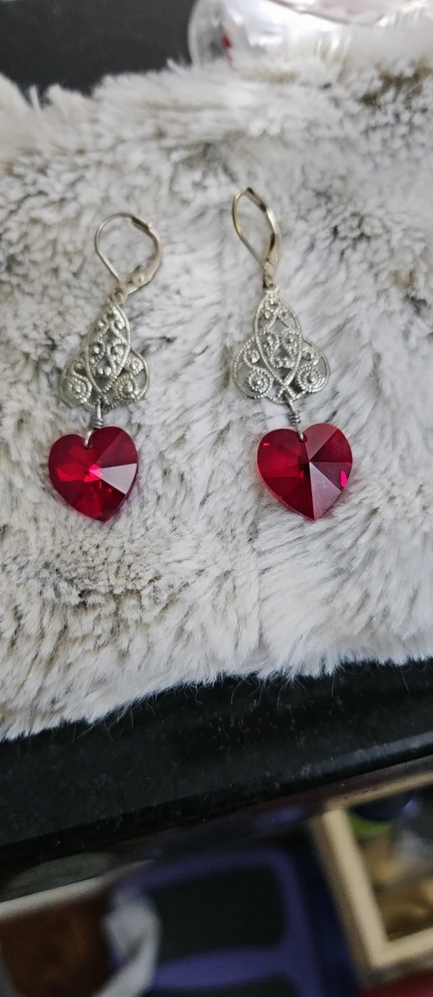 1000+Cute pair of dangle earrings! They feature a silver filigree design and a vibrant red heart charm. Perfect for adding a pop of colour to any outfit