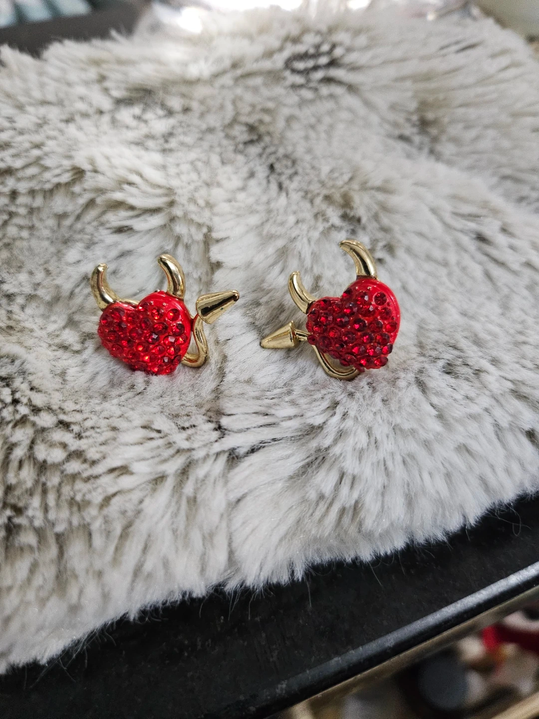 1000+These are a pair of adorable earrings with a red heart design and devil horns! They're perfect for adding a playful touch to any outfit