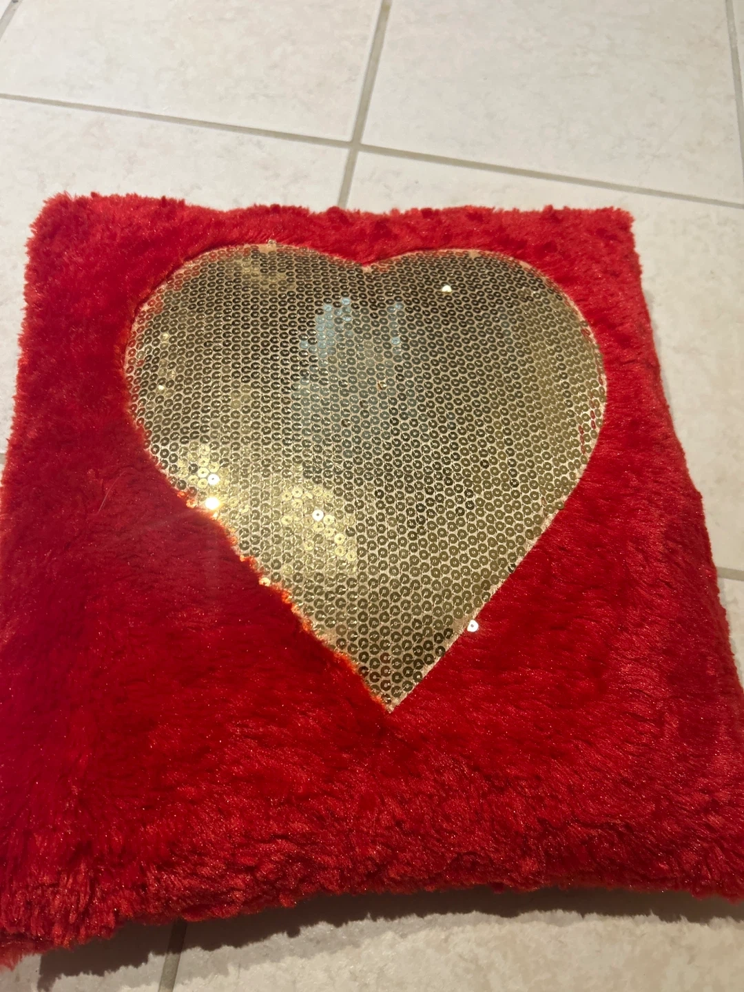 Selling a cute red pillow with a gold sequin heart on it! It's in great condition and would be a lovely addition to any room