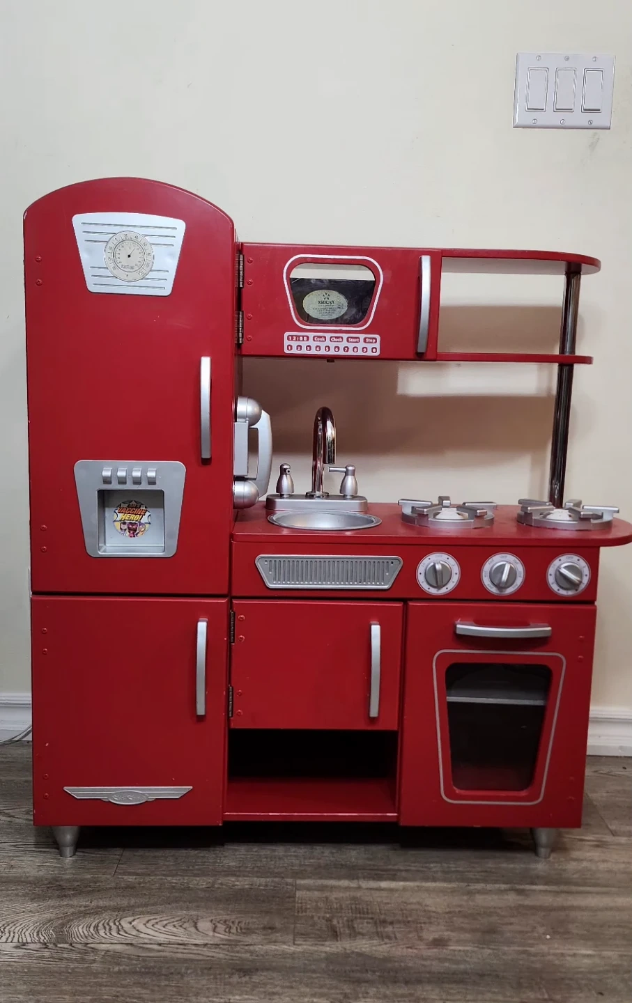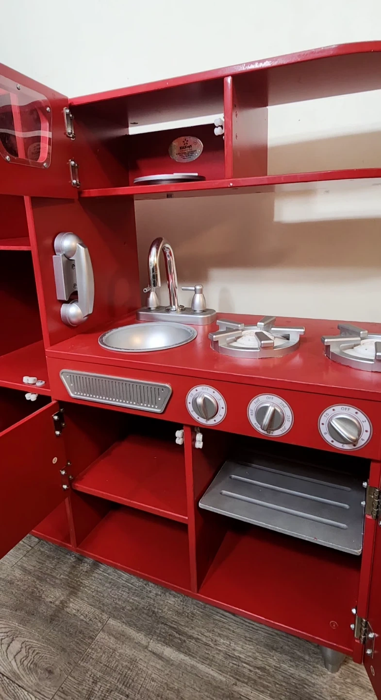 78This is a cute red KidKraft retro-style toy kitchen. It includes a fridge, sink, stove, and oven for lots of imaginative play. It's in good condition and ready for a new home! *** Moving Out Sale **** *** Price Negotiable *** Selling kids Kitchen set for sale. Dimensions - 34.92" H x 33.07" x 13.23" D Material - Manufactured Wood From a clean, Smoke free, Pet free home. Pickup Location - 1 Elm Drive West, Mississauga, L5B4M1.
