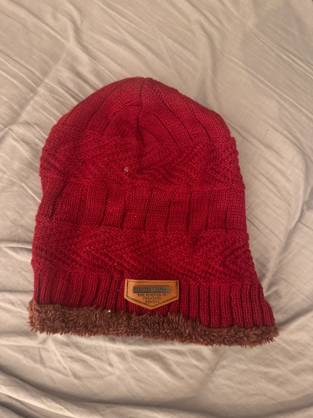 Keep warm this winter with this cozy red knit beanie! It features a soft fur lining for extra comfort and style. The beanie is in great condition and ready to keep you snug during those chilly Canadian days
