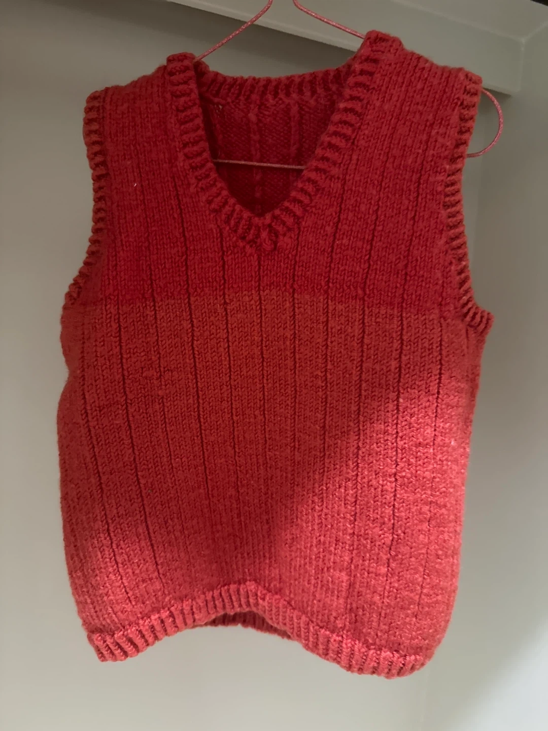 60Here's a cozy red knit vest! It's in great condition and perfect for layering during the cooler months. The vest has a classic V-neck design and a ribbed texture throughout. It's a stylish and comfortable piece to add to your wardrobe