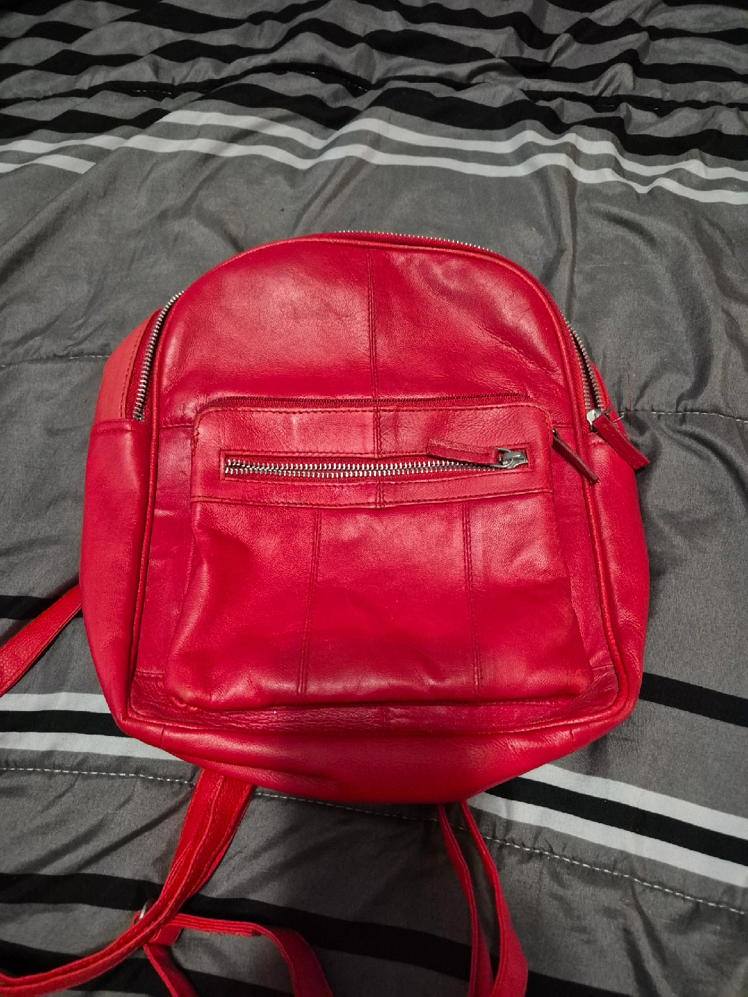 20Selling a cute red leather backpack! It's in great condition and has a zippered front pocket. Perfect for everyday use or travel