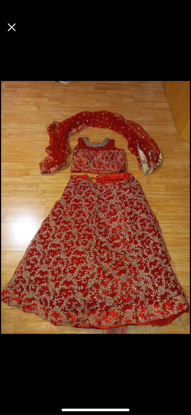 Selling a beautiful red lehenga choli with dupatta. The fabric is adorned with intricate embroidery. Perfect for a special occasion!