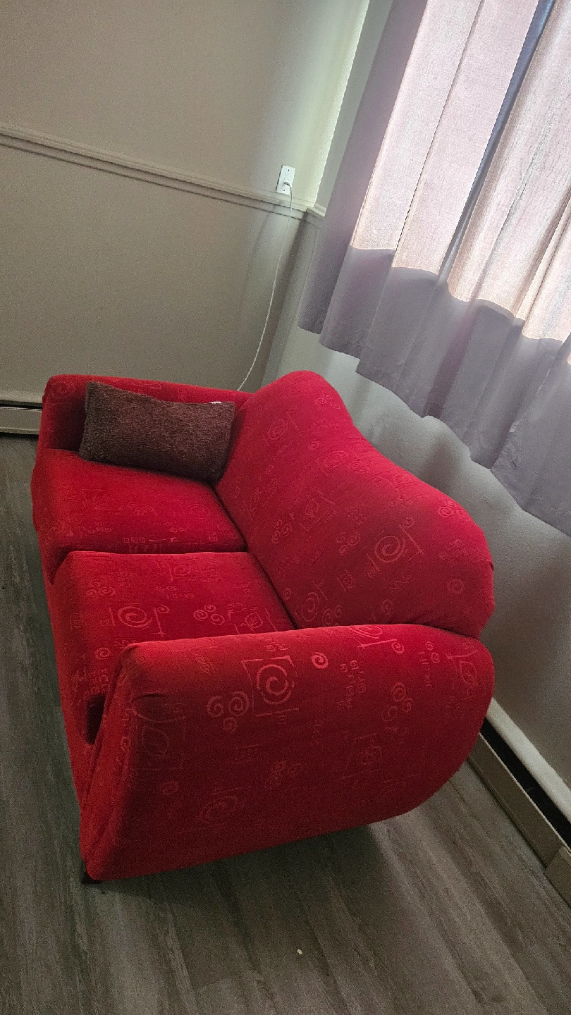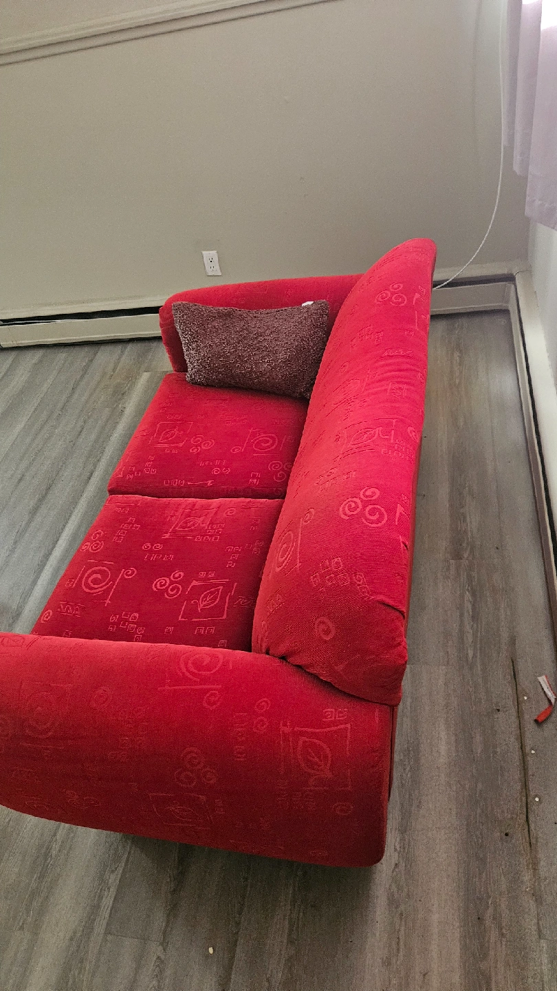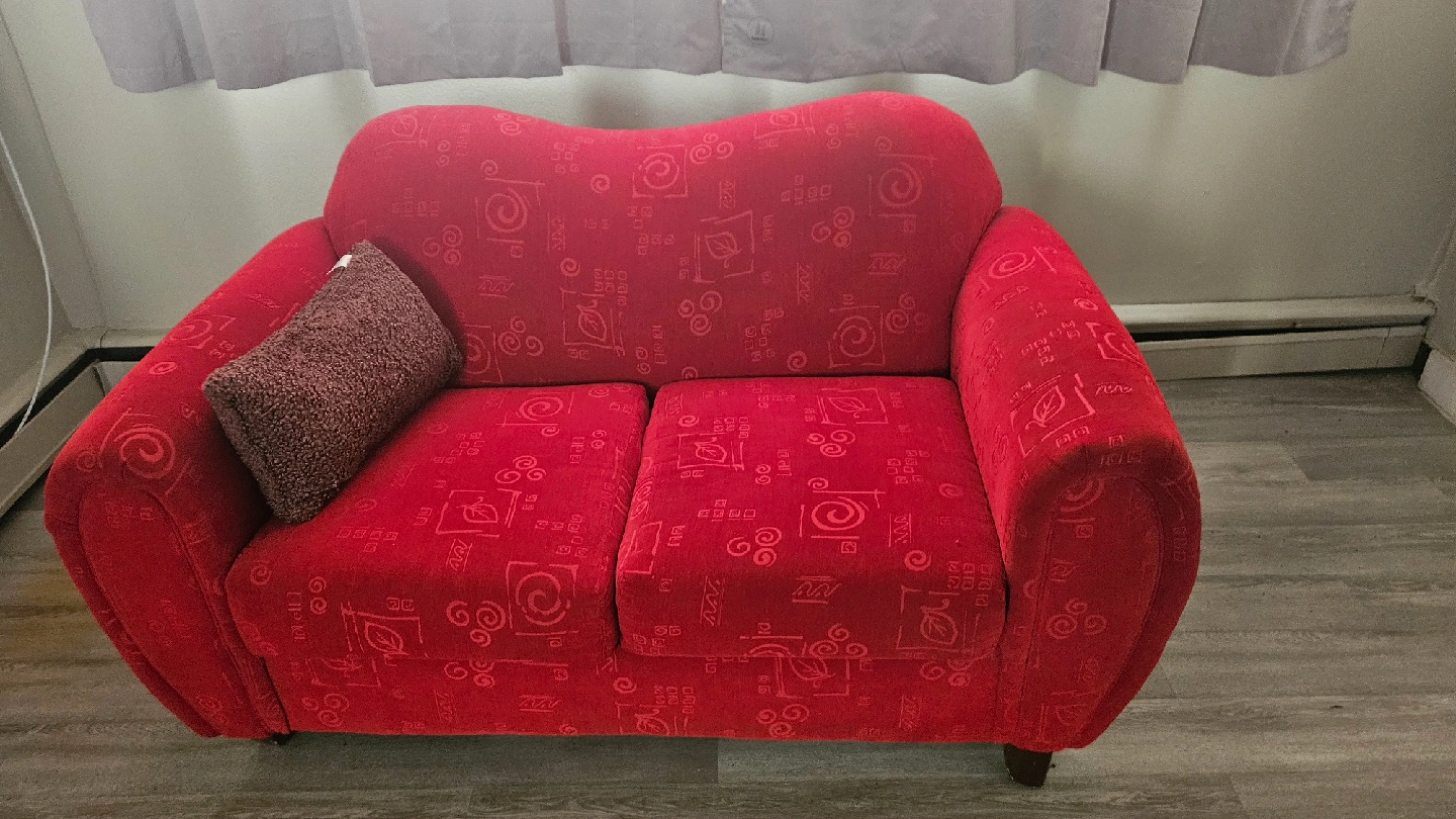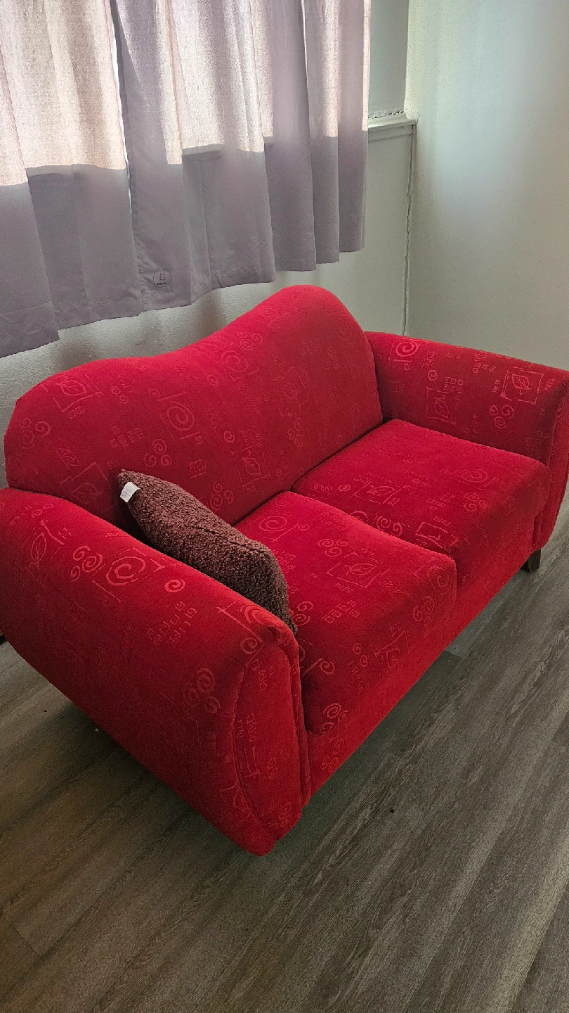 65A cute red loveseat sofa, perfect for a smaller space! It's in good condition and ready for a new home. A throw pillow is included! 60" x 31" x 21"
