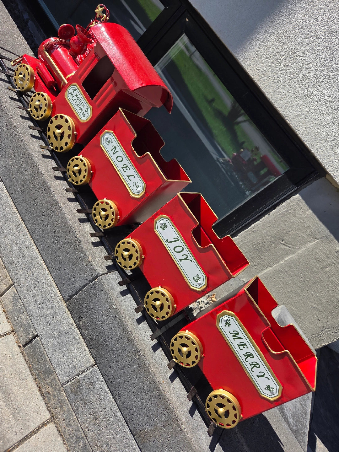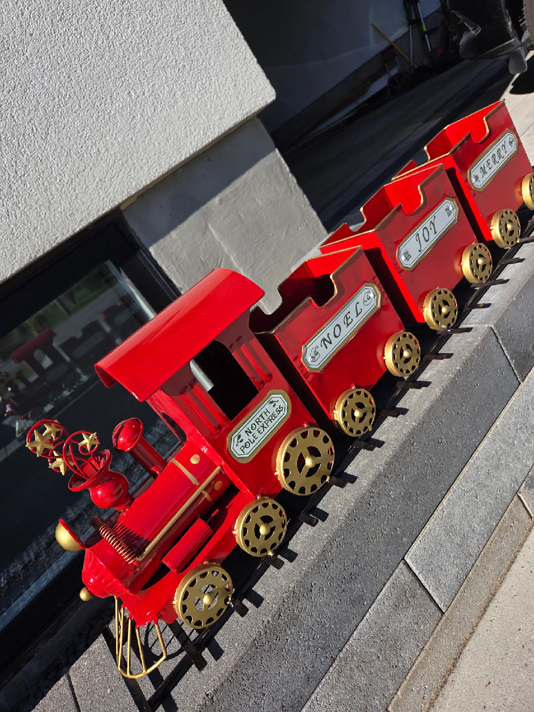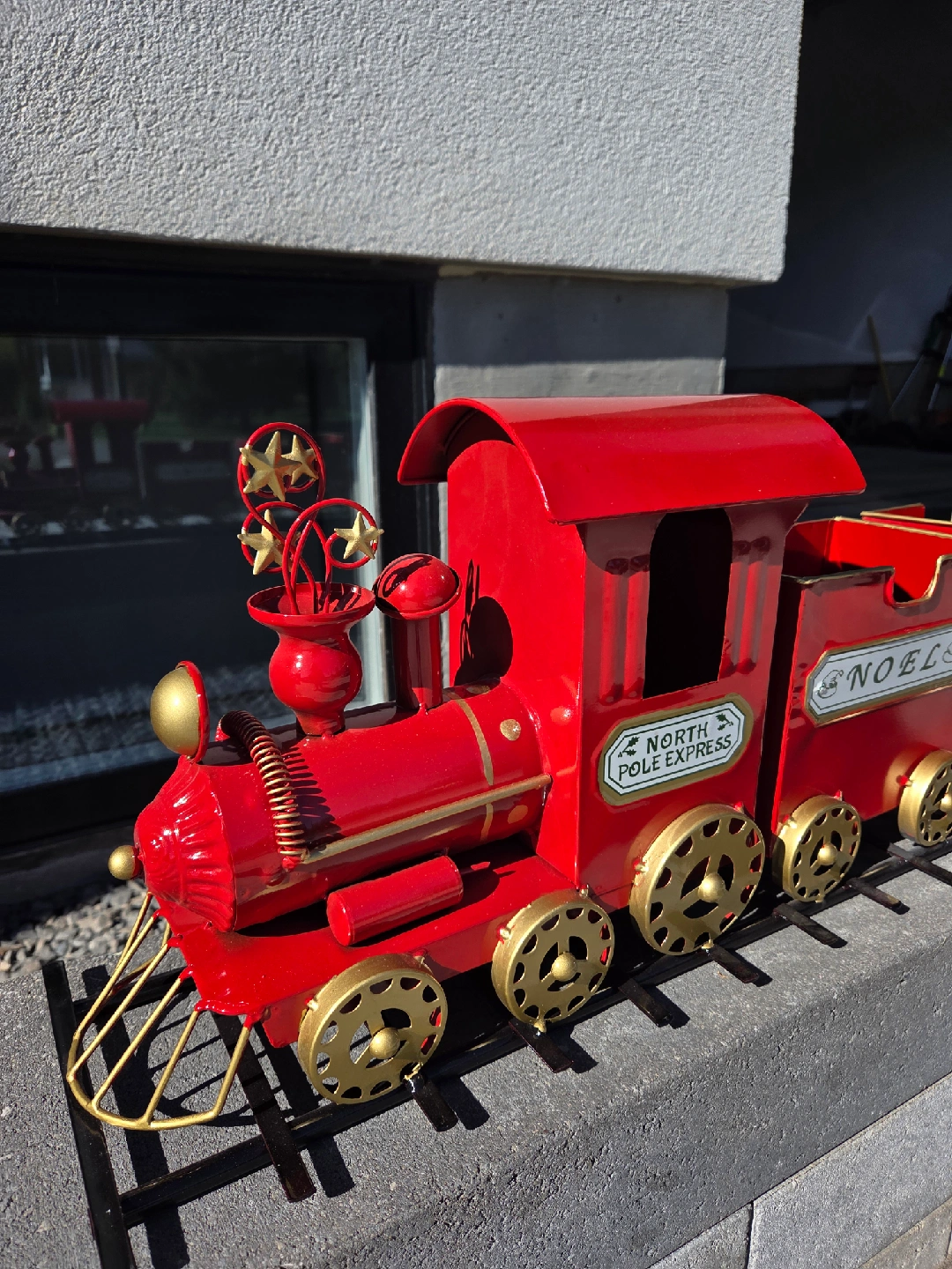 Add a touch of festive cheer with this adorable red metal Christmas train decoration! It features the North Pole Express, along with "Noel", "Joy", and "Merry" on the train cars. Perfect for adding a bit of holiday spirit to your home