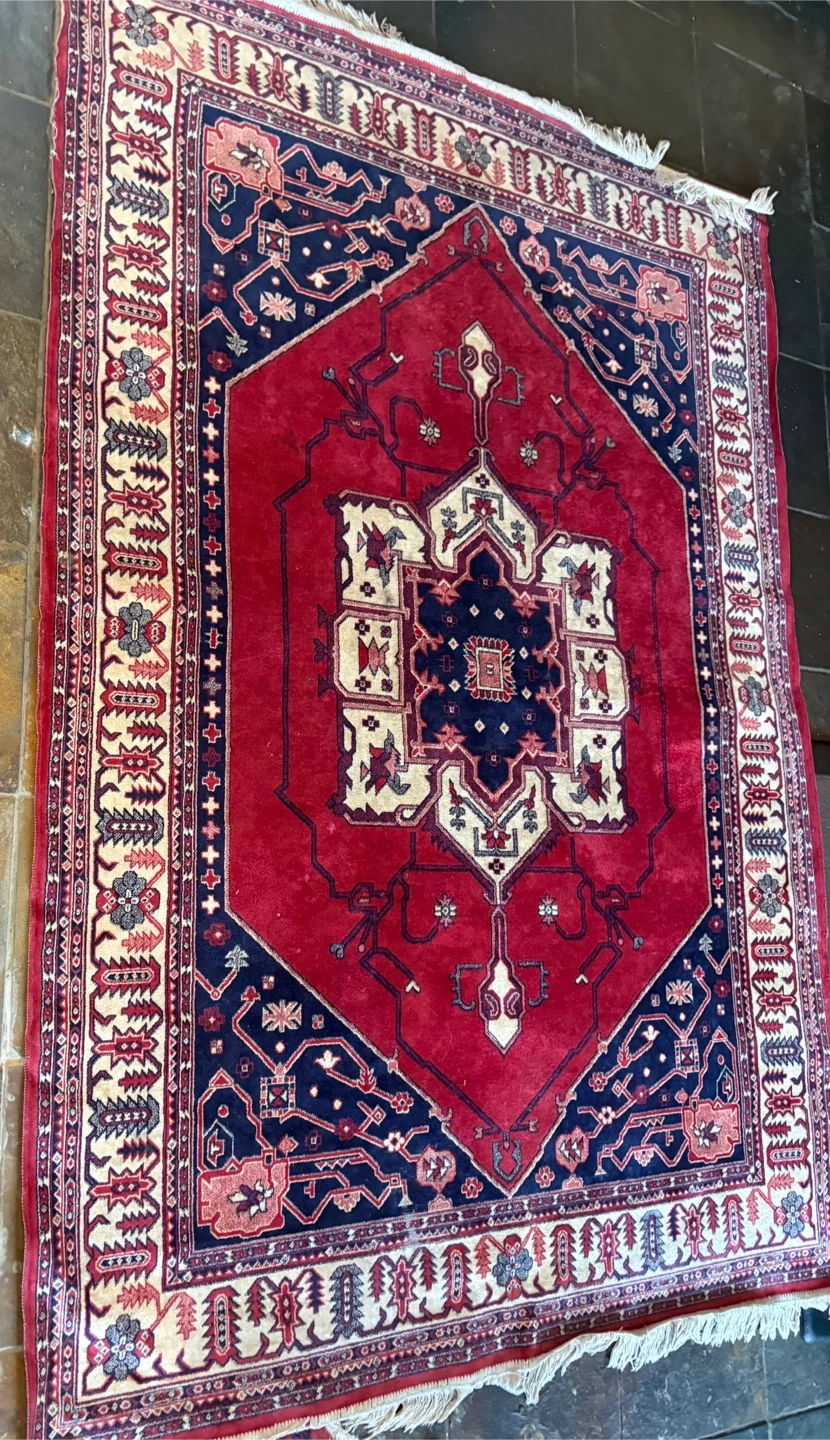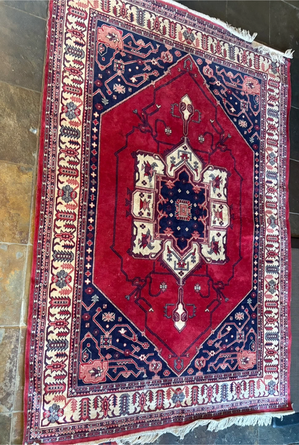 Beautiful area rug featuring a vibrant red and navy design! It would look great in any living room or bedroom. It's in good condition and ready for a new home