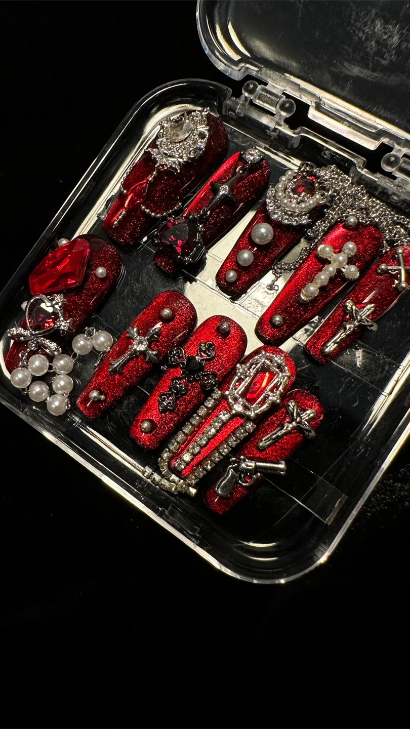 10Selling a set of red press-on nails. They're decorated with silver charms, including crosses, chains, pearls, and rhinestones. Perfect for adding a bold touch to your look!