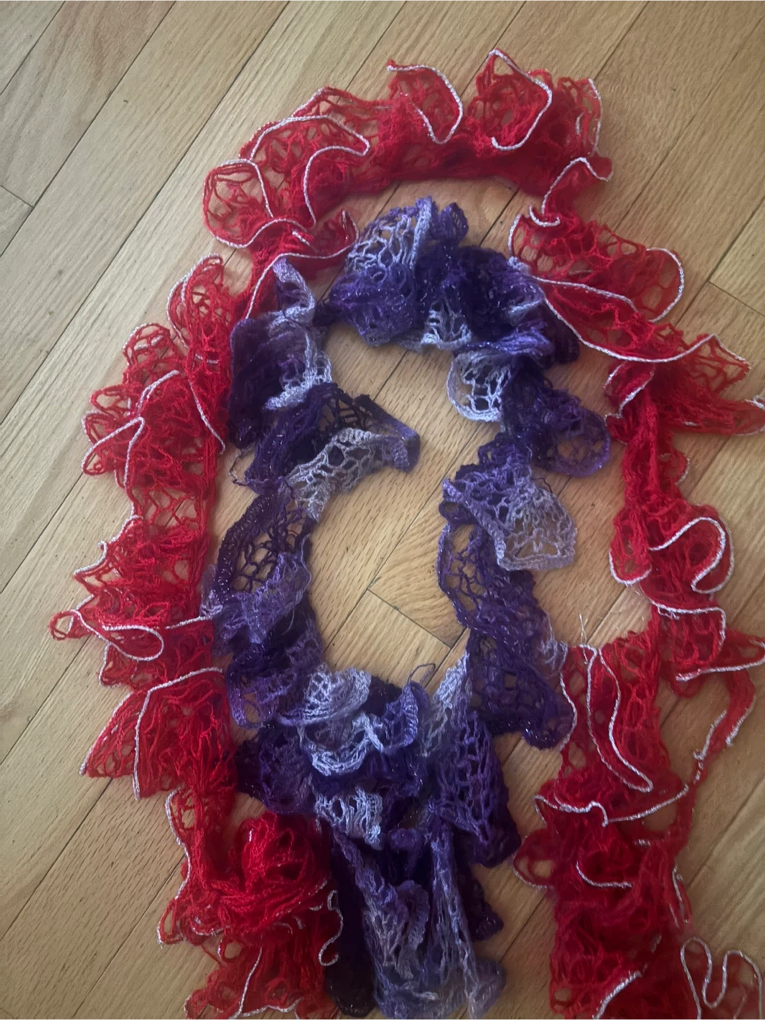 10A beautiful and unique ruffle scarf in vibrant shades of red and purple! It's perfect for adding a pop of colour to any outfit. The intricate knit design and ruffled edges make it a stylish accessory for any occasion