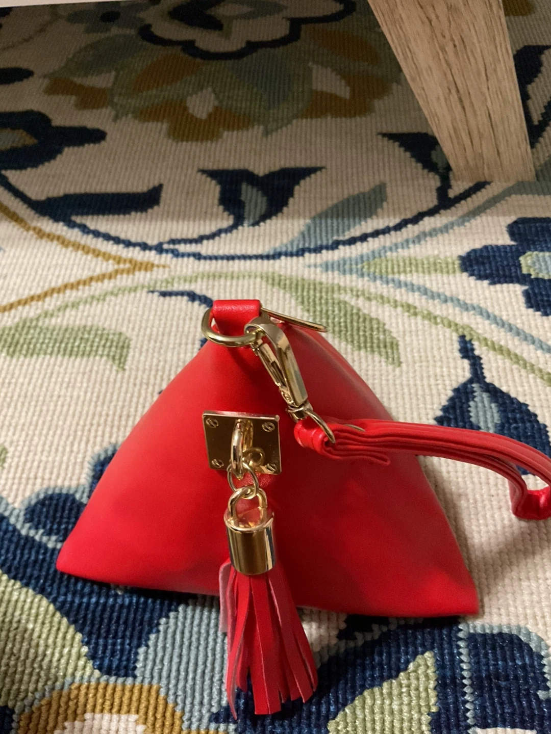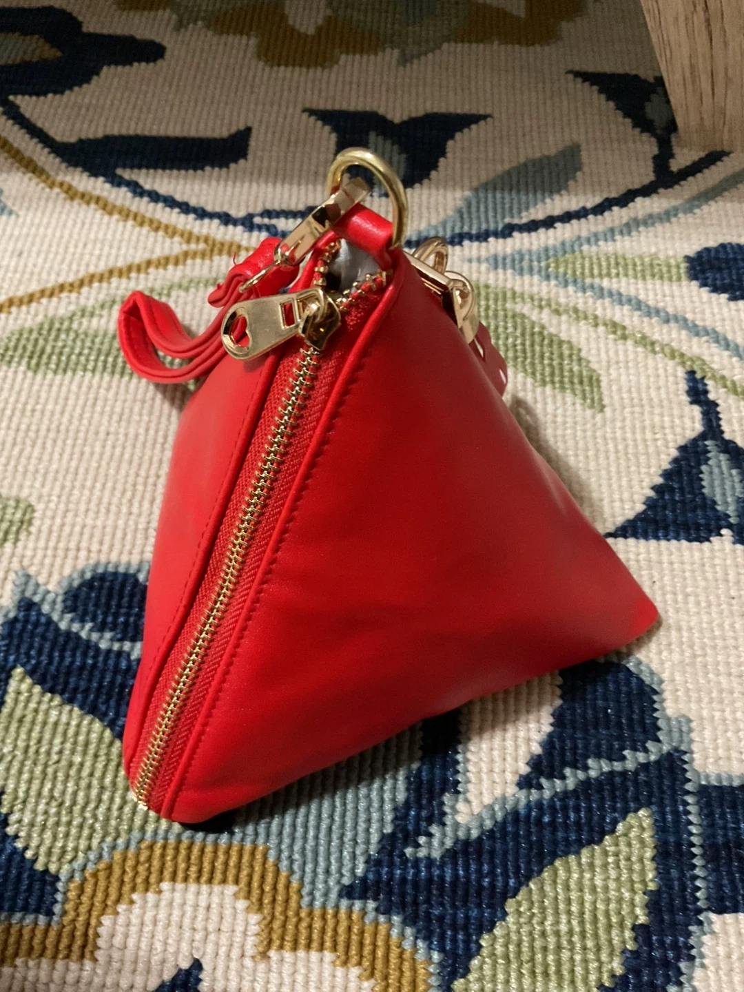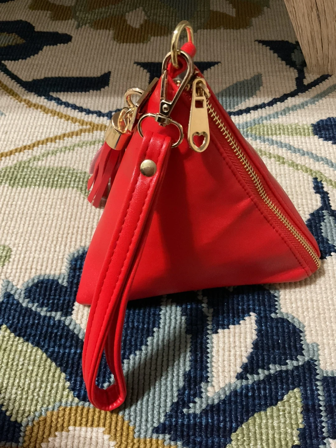 1000+This is a unique red pyramid-shaped handbag. It features a gold zipper with a heart detail and a tassel. It's a fun and stylish accessory to add to your collection