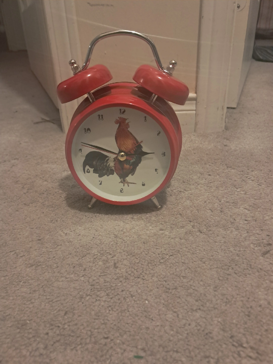 Red rooster alarm clock in good condition. It's a charming addition to any room and will wake you up with a traditional alarm sound! The clock face features a rooster design, adding a touch of country charm