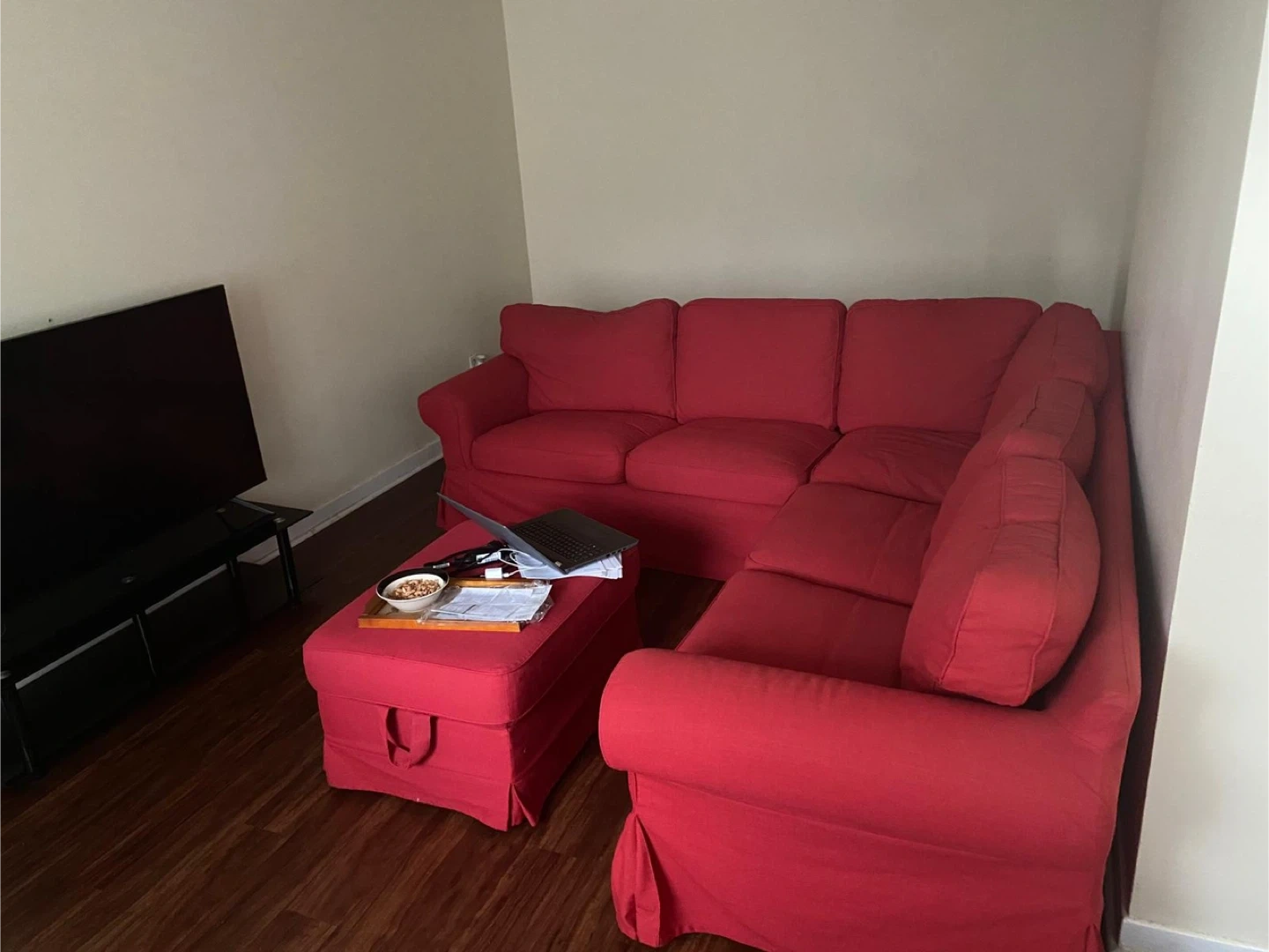 Selling a comfy red sectional sofa, perfect for a living room! It comes with a matching ottoman, great for kicking your feet up after a long day. The colour is a vibrant red that will add a pop to any space.