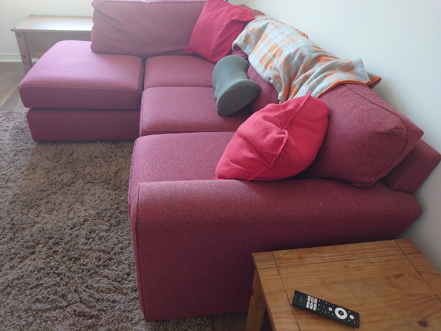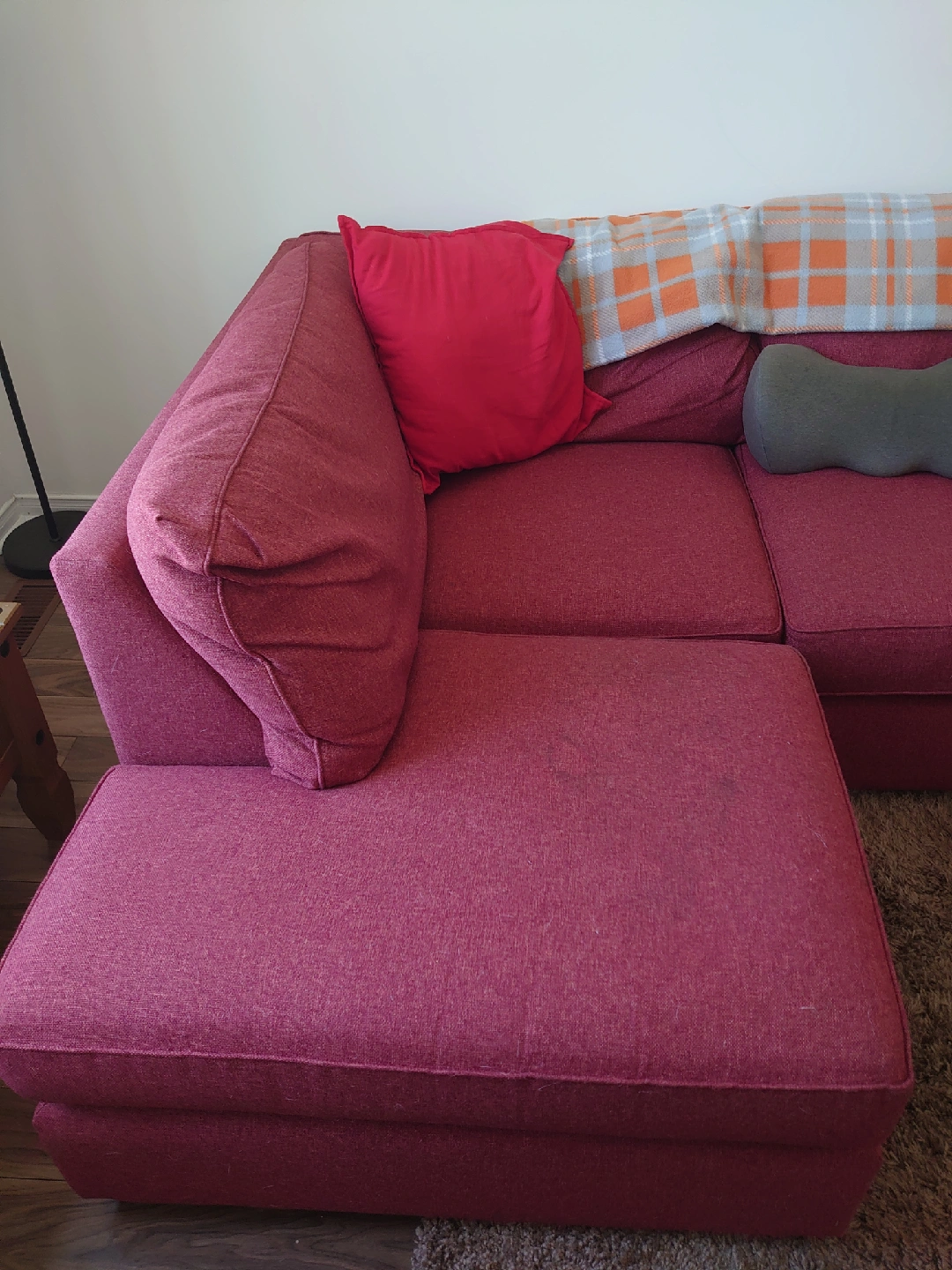 60Selling a comfortable red sectional sofa. It's in great shape and ready for a new home! Perfect for lounging and adding a pop of colour to your living room. Fabric has Scotchgard, all cushions zip off for easy cleaning. $350 ono