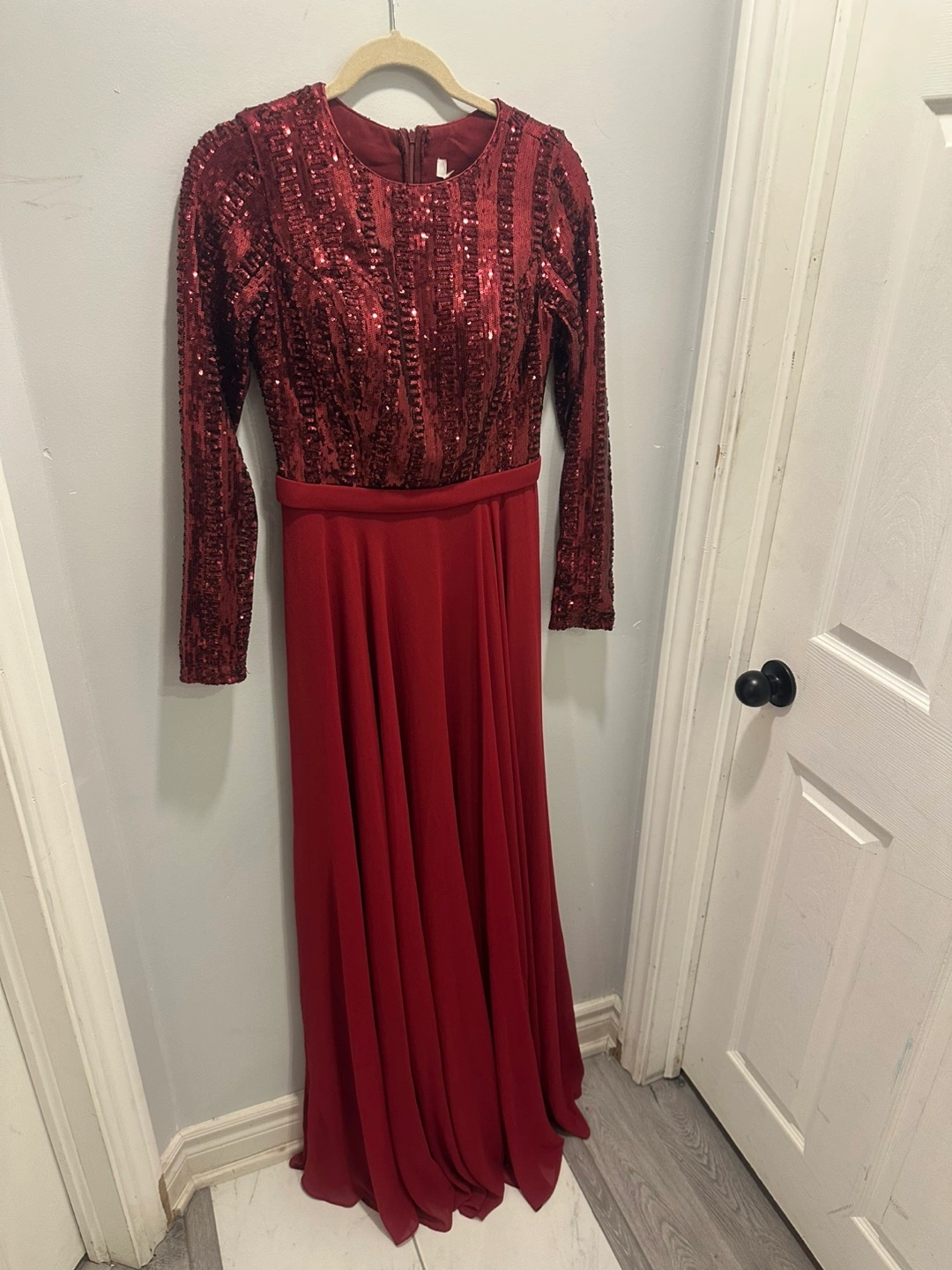 10Long sleeve gown. Sequin bodice. Long flowing skirt. Would make an excellent dress for a special occasion.
