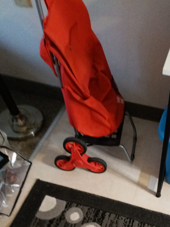 Selling a red shopping trolley! It has a unique 3-wheel design to make going up stairs a breeze. Perfect for carrying groceries or other items with ease