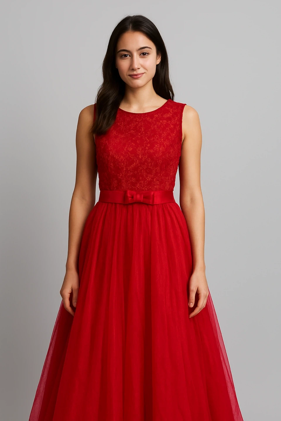 10A beautiful red sleeveless dress, perfect for a special occasion! The top part has a lovely floral pattern with delicate beading, and the skirt is made of a flowy tulle material. It features a ribbon at the waist to complete the look
