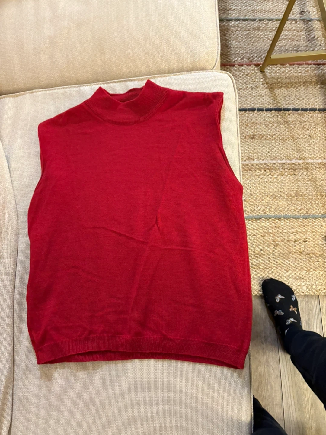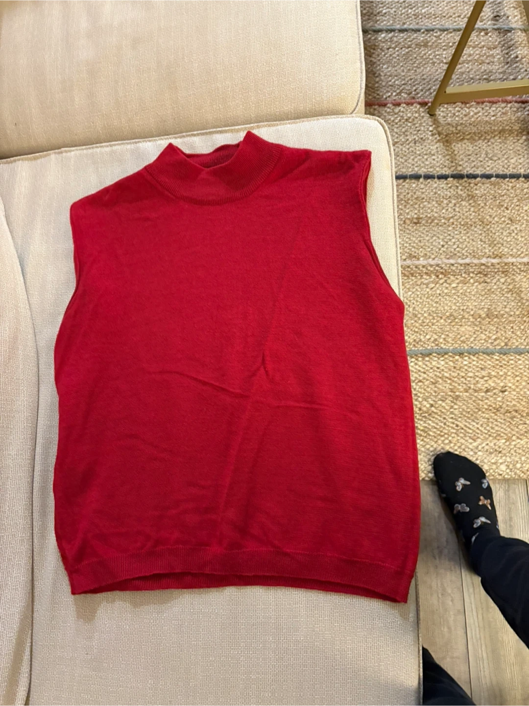 A lovely red sleeveless knit top, perfect for layering or wearing on its own. It's in great condition and ready for a new home!