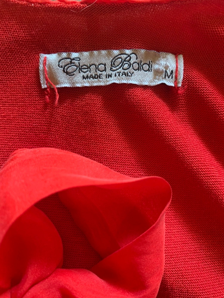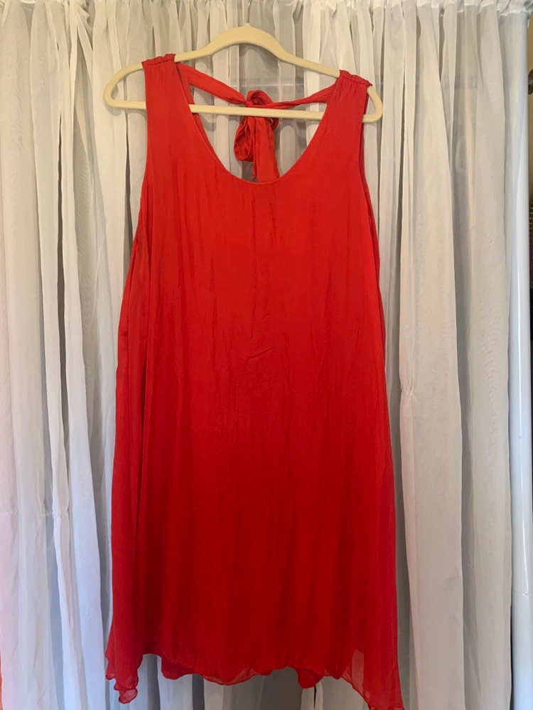 A sleeveless 100 % silk red dress with a bow tie detail on the back. The dress has a loose fit and a slightly A-line shape. It is perfect for a casual or semi-formal occasion.