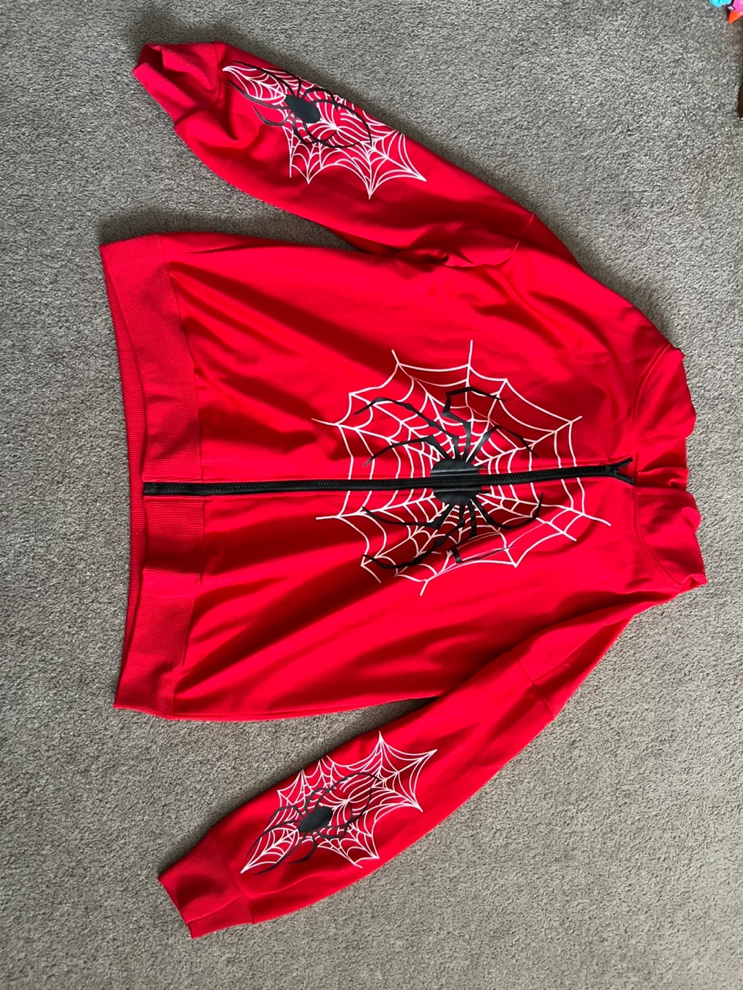65Bright red zip-up jacket with a cool spider web design on the sleeves and back! It's in great condition and ready for a new home