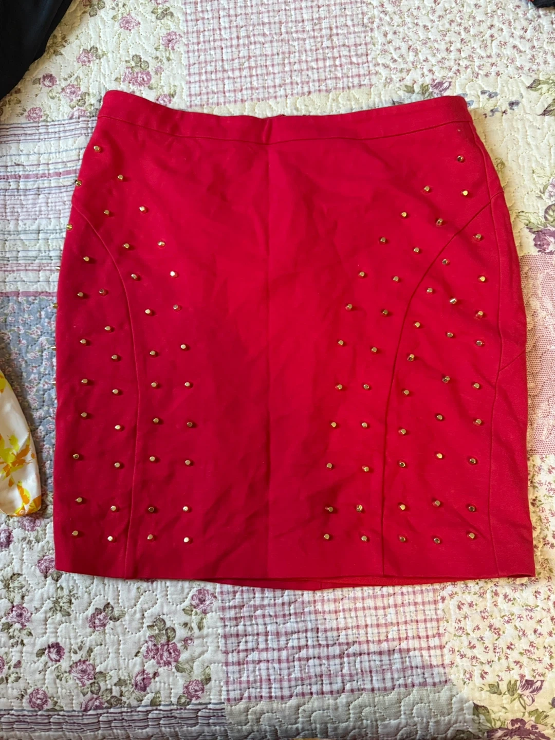10A vibrant red skirt with studded detailing! This skirt is perfect for adding a pop of colour and a bit of edge to your wardrobe. It's in great condition and ready for a new home
