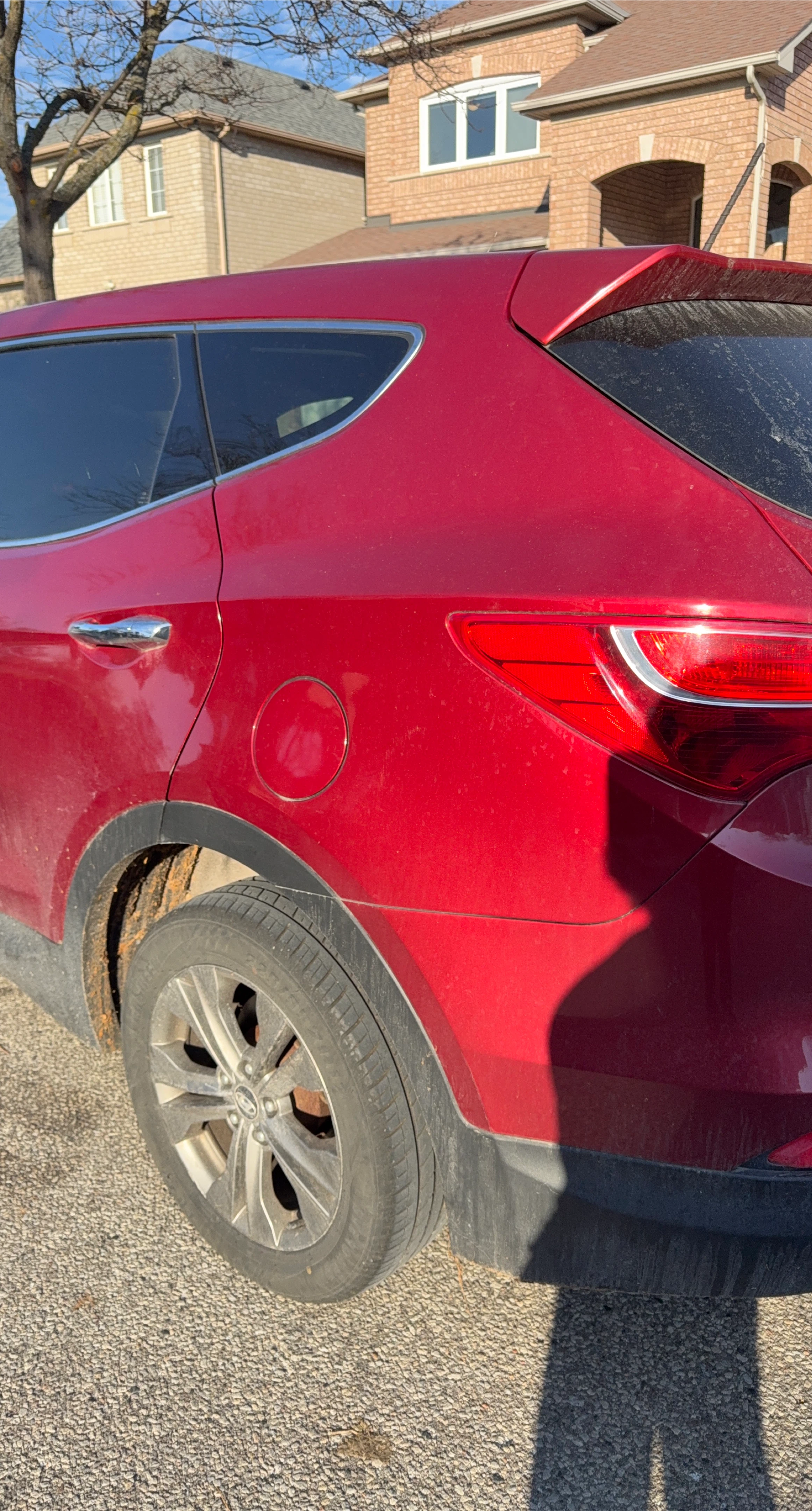 Here's a red SUV, possibly a Hyundai Santa Fe, that could be a great fit for someone! It has some wear and tear as you can see in the pictures, especially around the wheels, but it's still in good working condition , engine was recalled recently so it’s new engine