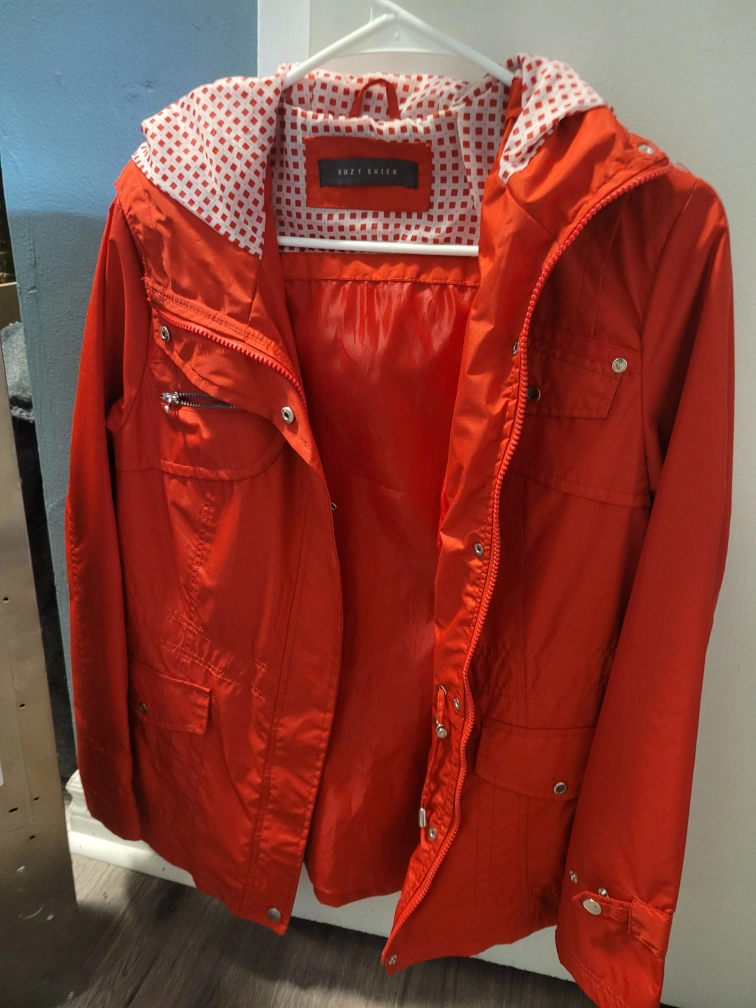 14Red jacket with hood and zipper closure. Pockets on front and sleeves. pick up only