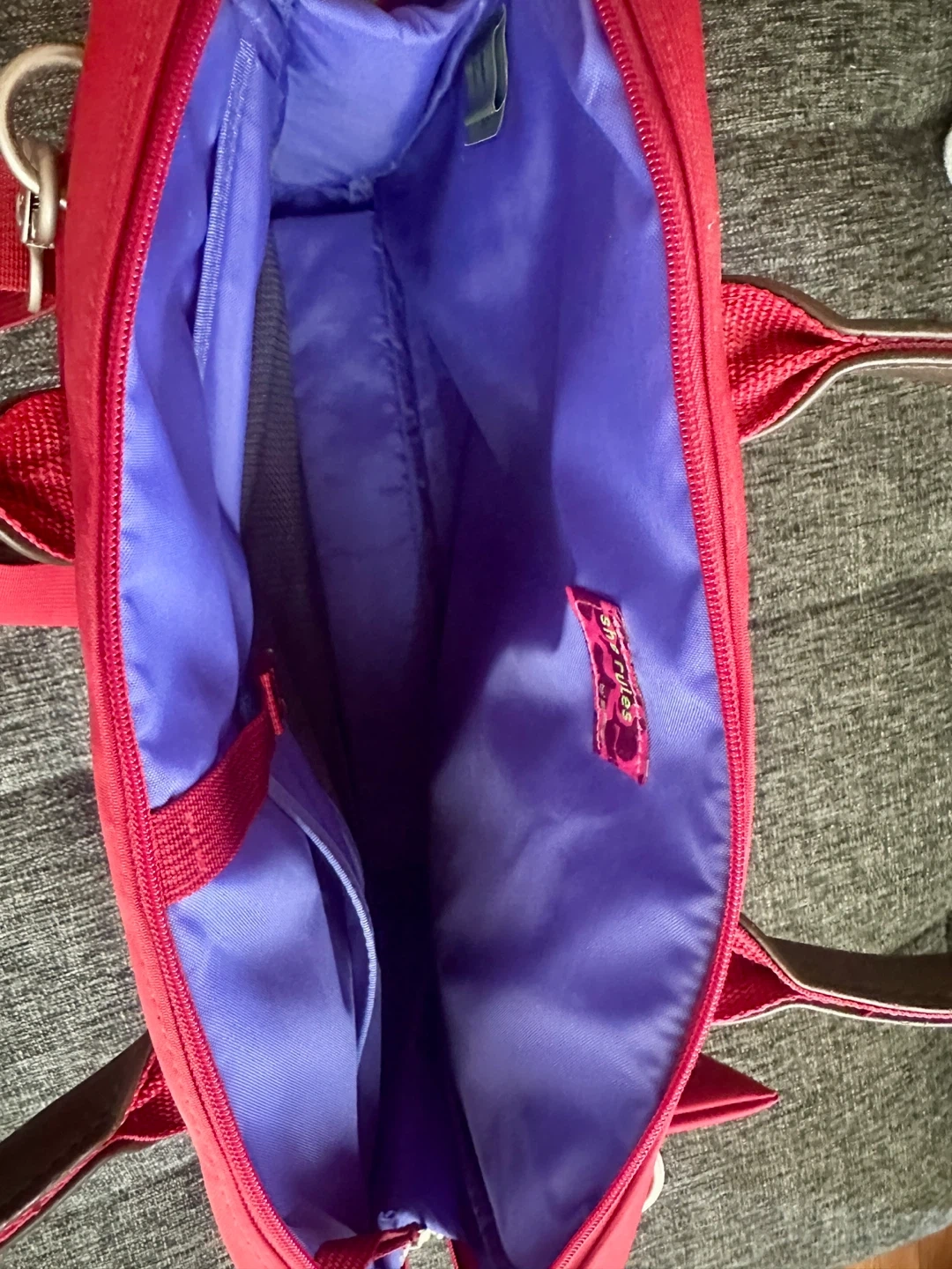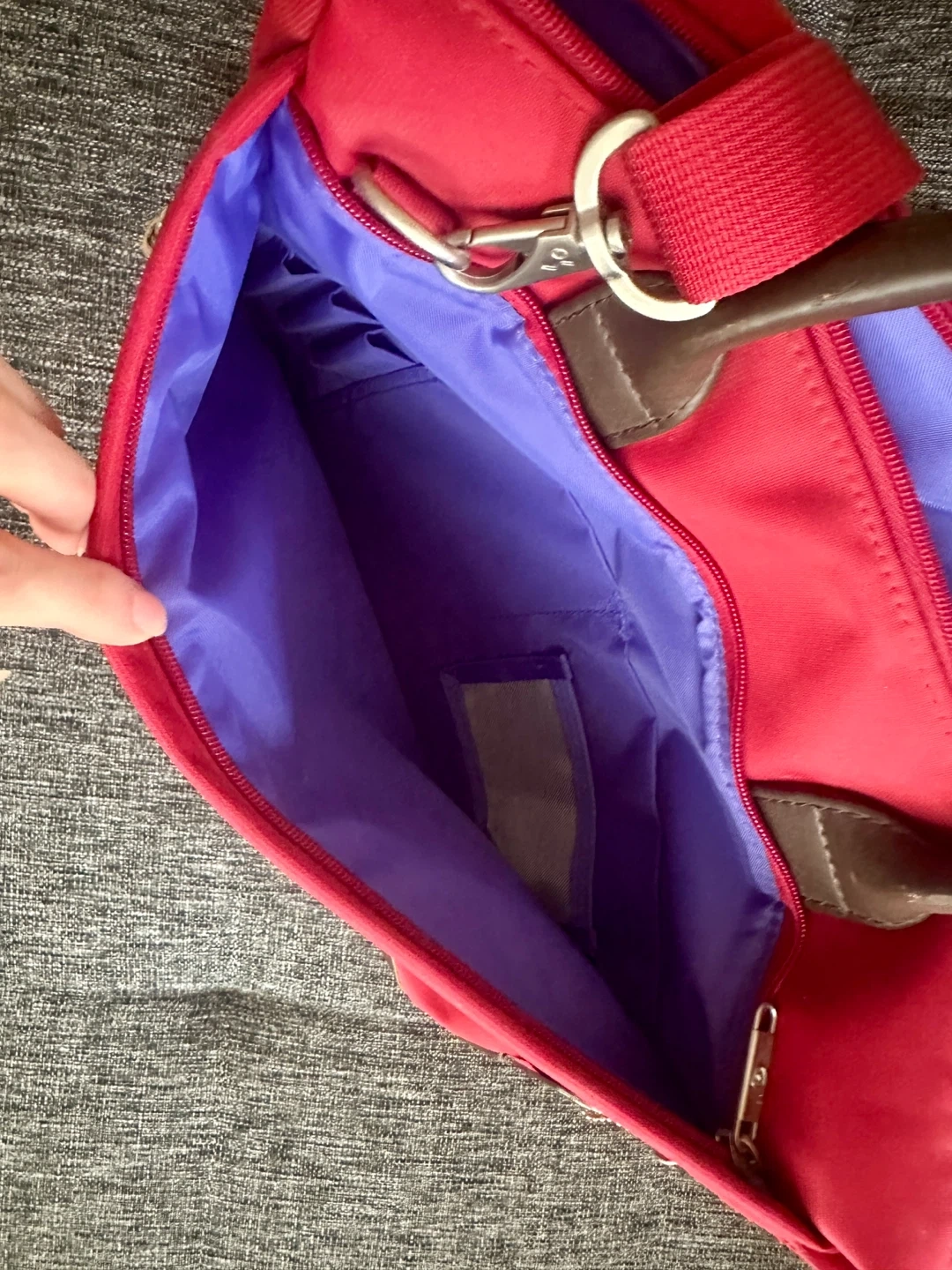 This red laptop bag is in good condition and ready for its next adventure! It's a stylish and functional way to carry your laptop and accessories. The interior is a vibrant purple. * Durable red exterior * Comfortable carrying handles * Removable shoulder strap * Multiple interior compartments * Bonus attachable zip pouch