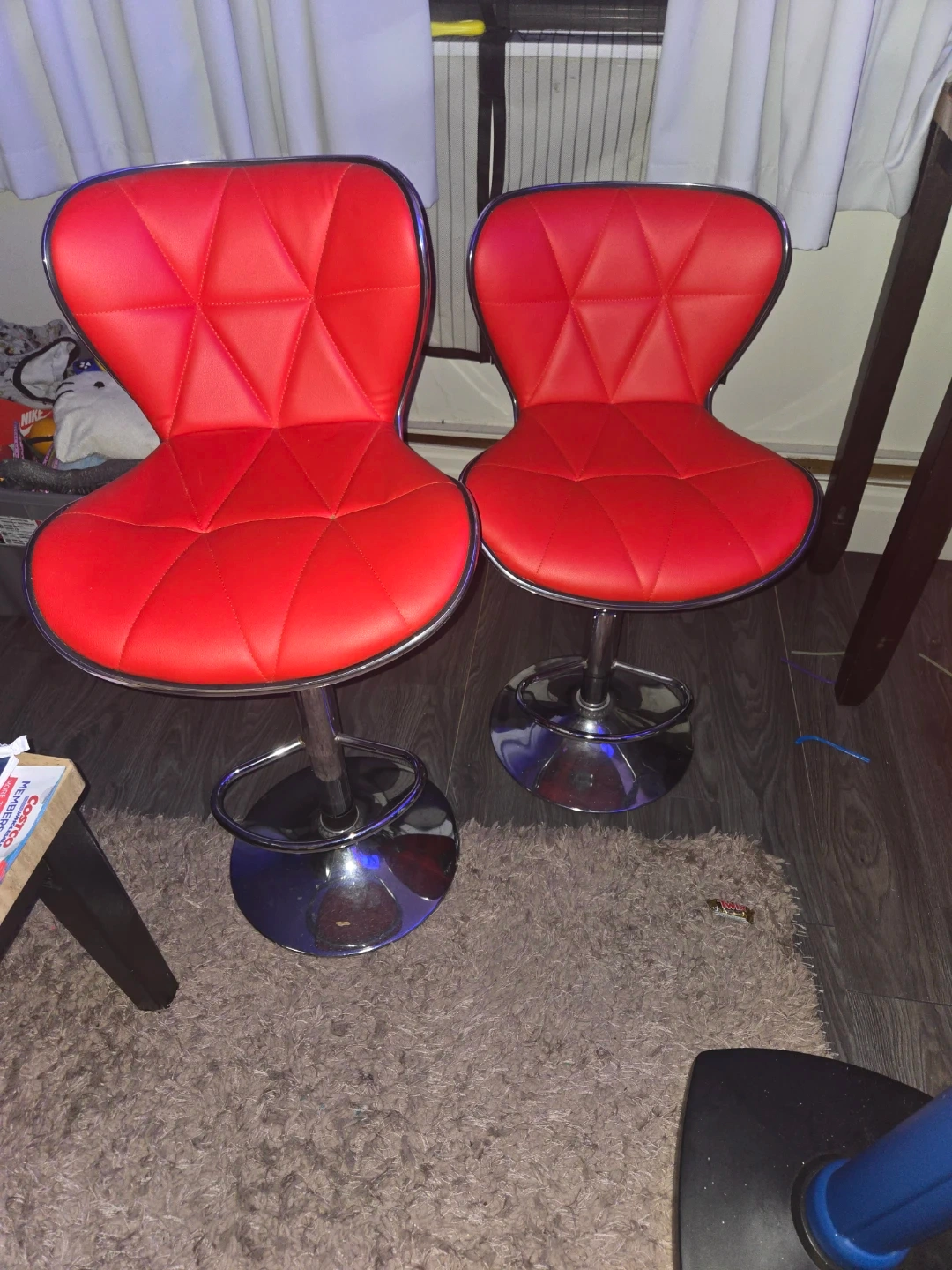 60Selling a set of two vibrant red swivel bar stools! They're perfect for adding a pop of colour to your kitchen or bar area. These stools feature a comfortable seat and a sturdy chrome base. They're in great shape and ready for a new home!