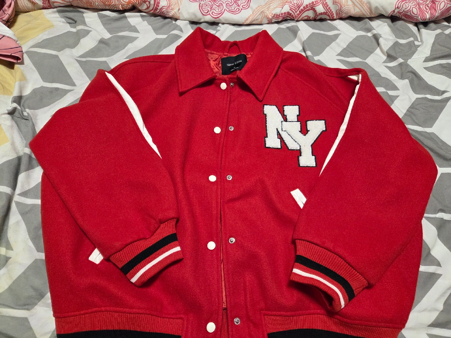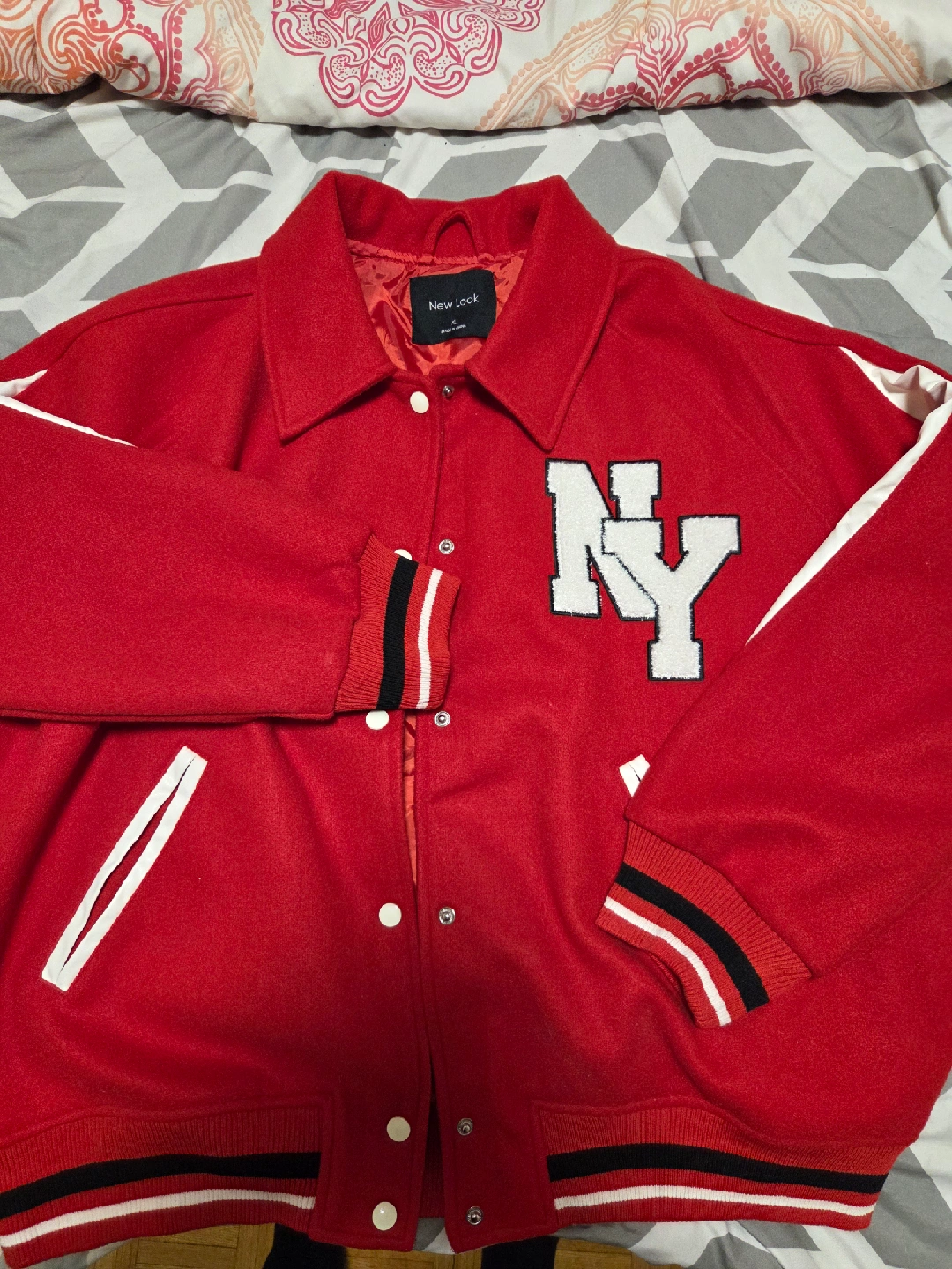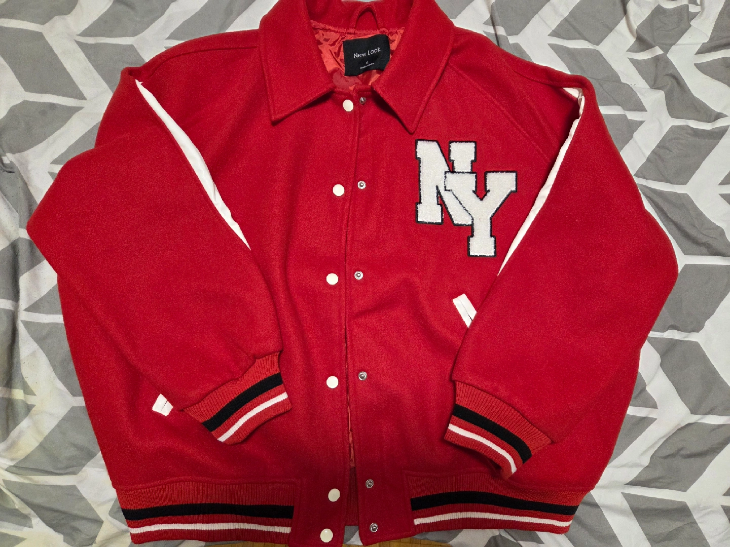 76Here's a stylish red varsity jacket from New Look! It features a classic design with white accents and an 'NY' emblem. Perfect for adding a pop of colour to your wardrobe