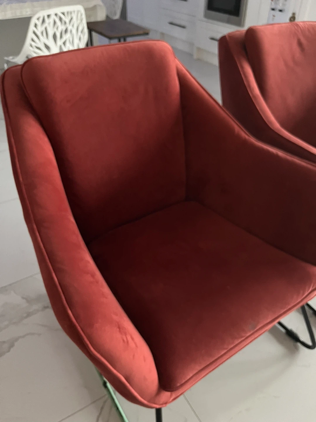 91Selling a set of two lovely red velvet accent chairs! They're in great shape and would add a pop of colour to any room. The chairs have a modern design with comfortable seating, perfect for a living room or bedroom