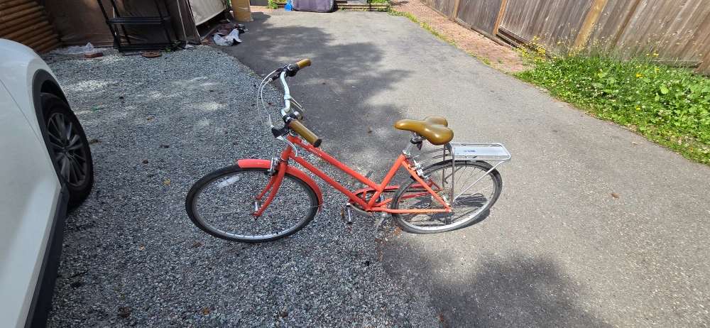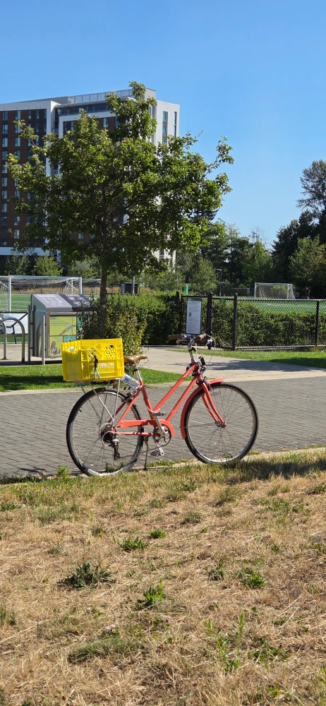 15Selling a vintage red bicycle that's ready for a new home! It comes with a yellow basket attached to the back, perfect for carrying groceries or your personal belongings. Also included are some accessories for phone. We trade near Dunbar South and sell it until Saturday morning. We also provide a small lock. Go ahead and buy it!