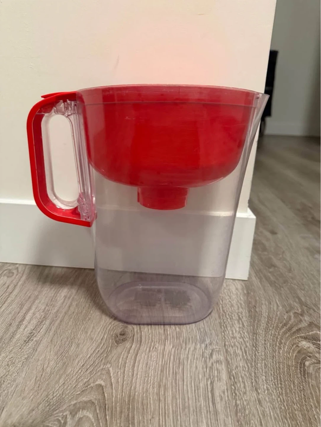 34Selling a water filter pitcher with a red filter basin and handle. It's in great condition and ready to use in your home!
