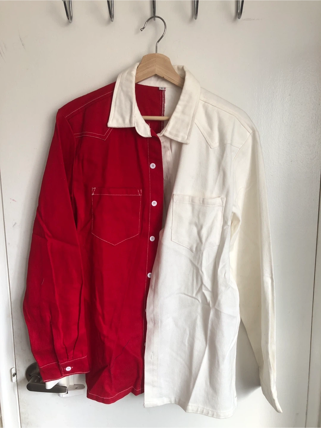 162Selling a unique colour block shirt! It's red on one side and white on the other. A really eye-catching piece for your wardrobe!