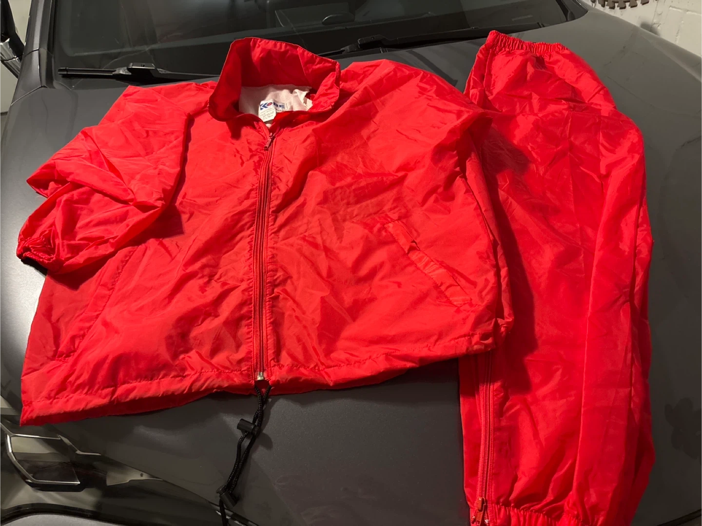 Selling a bright red windbreaker tracksuit. It's in great shape and ready for your next outdoor adventure or just lounging around. The jacket has a zipper and pockets, and the pants also have zippers at the ankles. Perfect for staying warm and dry!