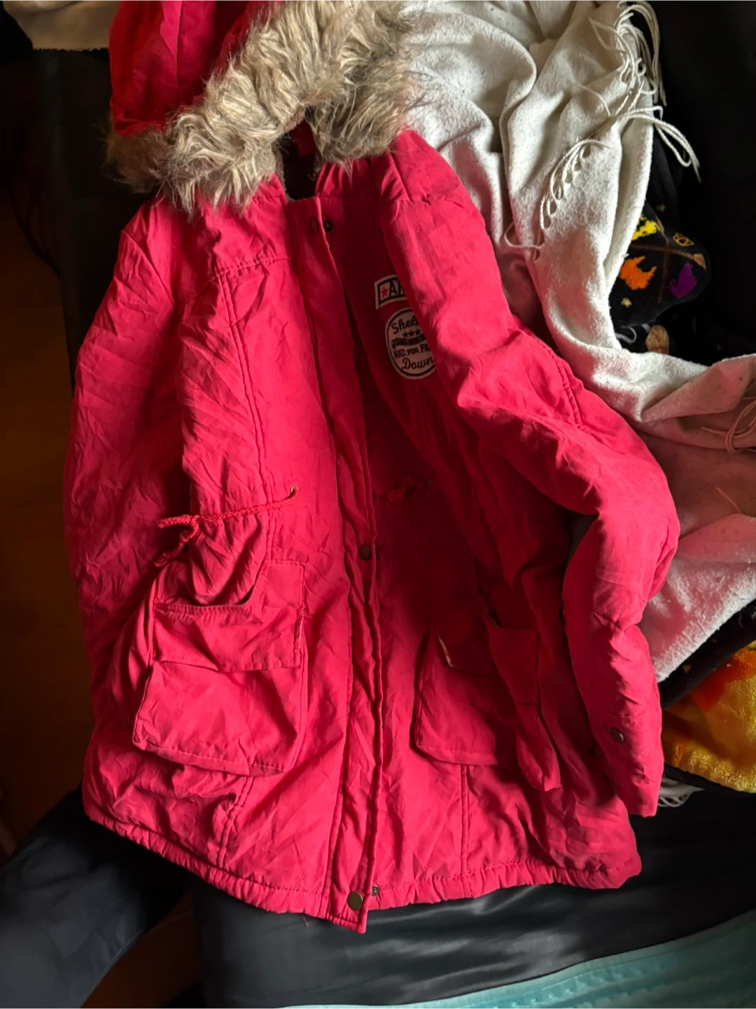 Snuggle up this winter with this cozy red parka! It features a faux fur-trimmed hood and a cinched waist for a flattering fit. Perfect for those chilly Canadian days! Worn once and been sitting in storage. Pickup and cash only.