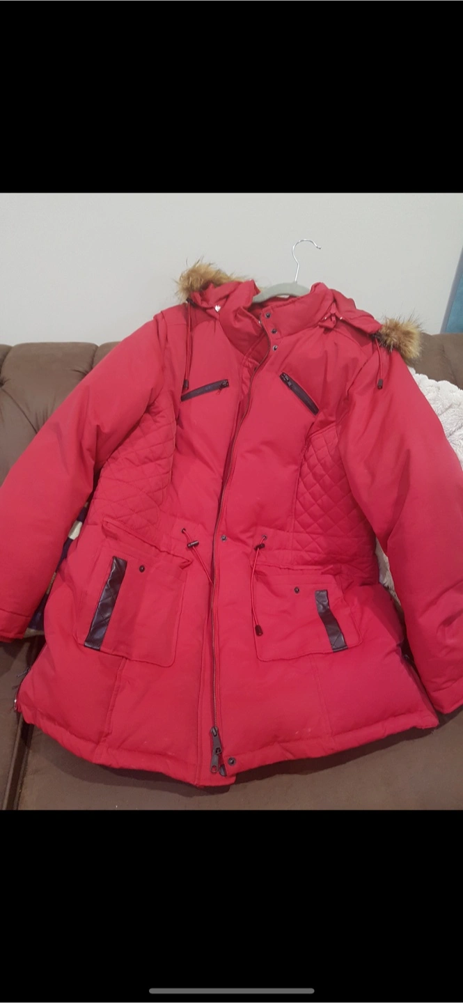 Here's a cozy red winter puffer coat! It has a fur-trimmed hood and some stylish details like the black accents. Perfect for staying warm during those chilly Edmonton winters. Just wore once.