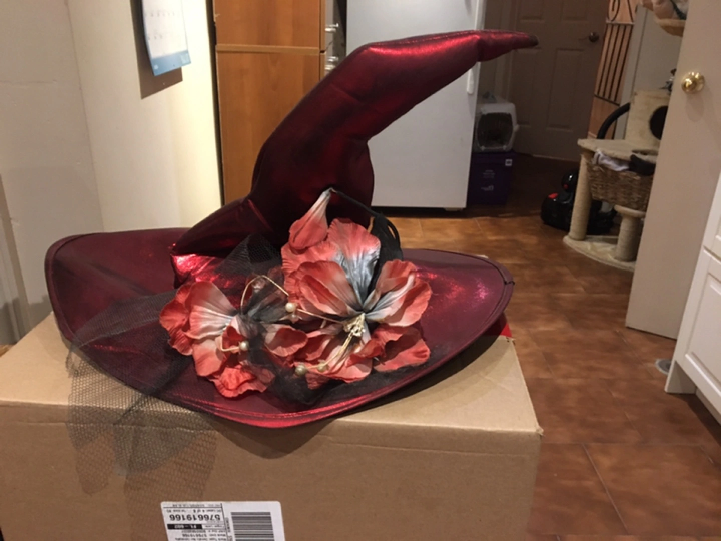 Offering a red witch hat, perfect for Halloween or costume parties! It's decorated with flowers and has a classic witchy look. Free to a good home.